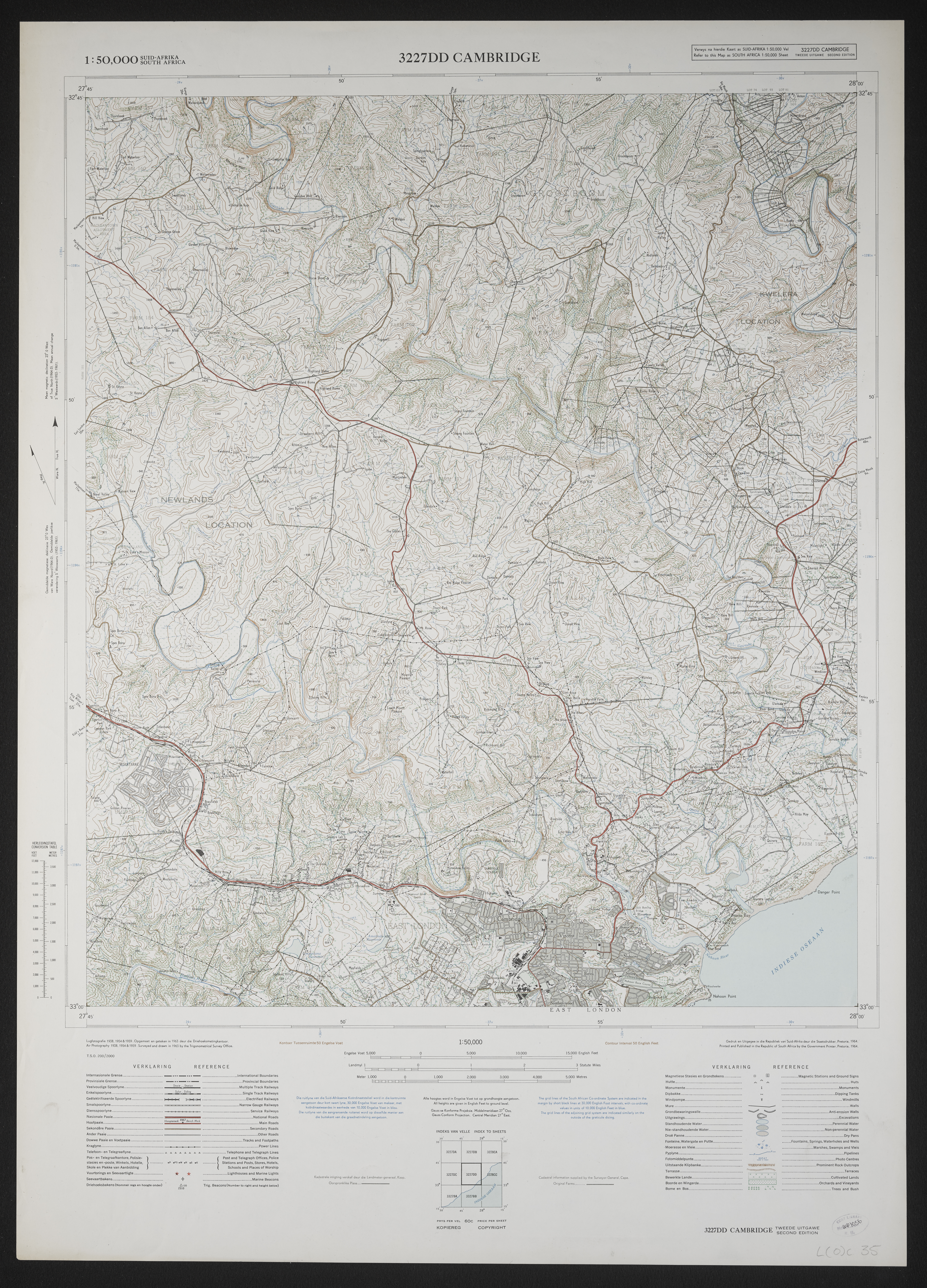 - 3227DD Cambridge, South Africa 1:50000 sheet. Air photography 1938, 1954 and 1959. Surveyed and drawn in 1963 by the Trigonometrical Survey Office. Lugfotografie 1938, 1954 and 1959. Opgemeet en geteken in 1963 deur die Driehoeksmeting Kantoor. T.S.O. 200/2000. Cadastral information supplied by the Surveyor-General, Cape. Second edition,Second edition