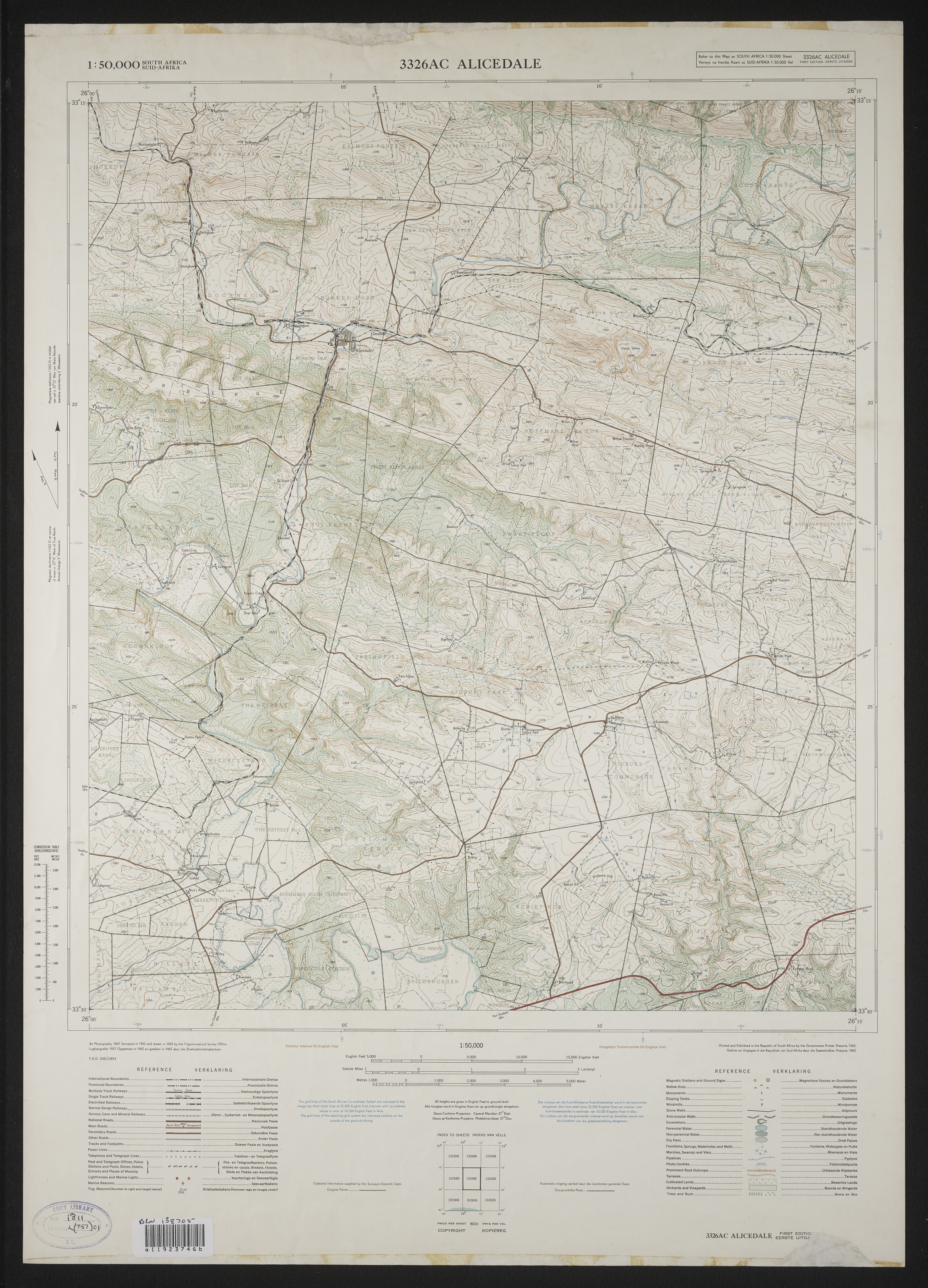 - 3226AC Alicedale South Africa 1:50000 sheet. Air photography 1957. Field survey 1962. Drawn by the Trigonometric Survey in 1963. T.S.O. 200/1893. (Lugfotografie 1957. Veldopmeting 1962. Saamgestel en geteken in 1963 deur die Driehokesmatings Kantoor.) First edition
