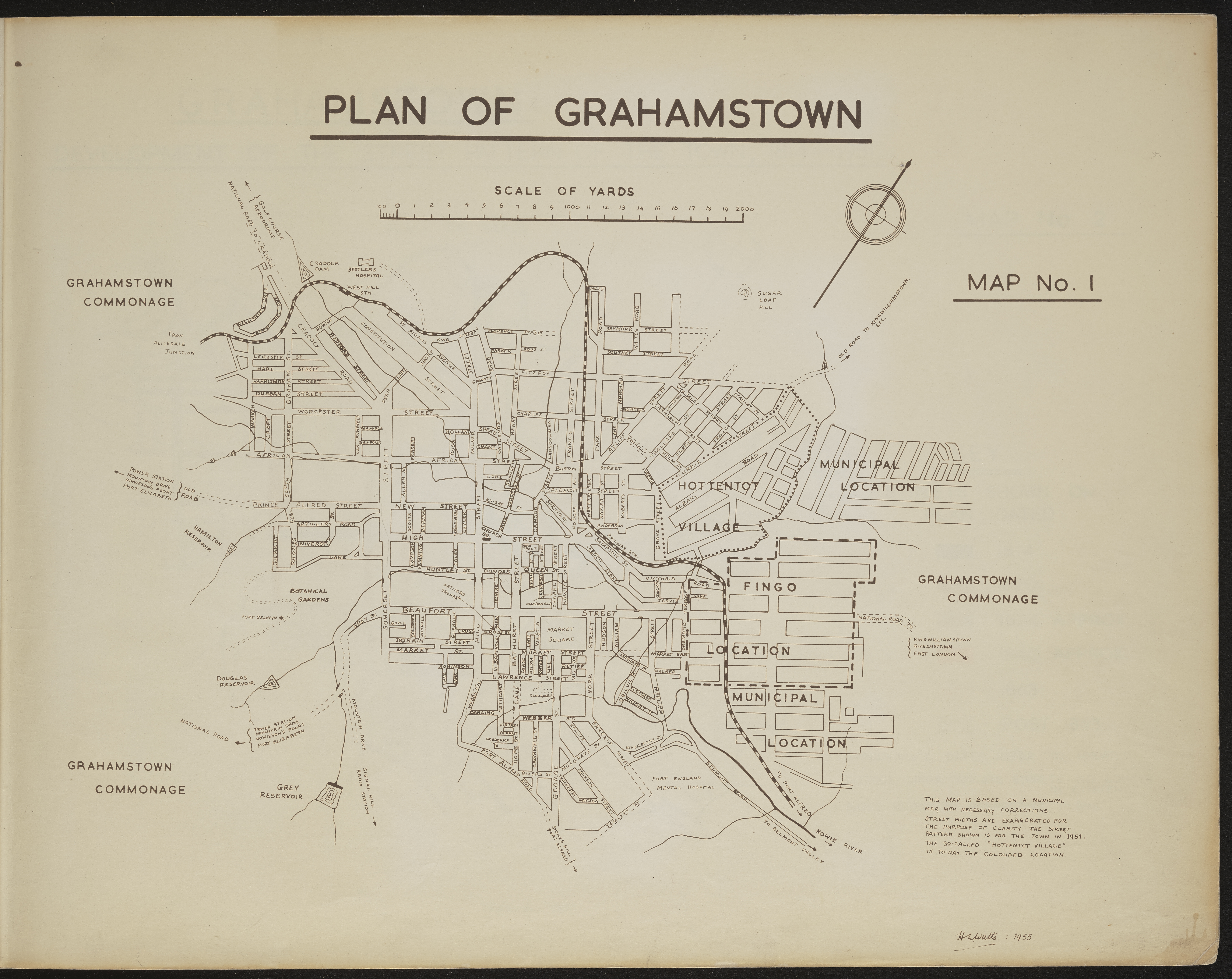 - Map 1 in the map album accompanying the thesis by Hilstan Lett Watts, "Grahamstown : a socio-ecological study of a small South African town", Rhodes University thesis, 1957. Map signed 1955. This map is based on a municipal map, with necessary corrections. Street widths are exaggerated for the purpose of clarity. The street pattern shown is for the town in 1951. The so-called "Hottentot Village" is today the Coloured location.