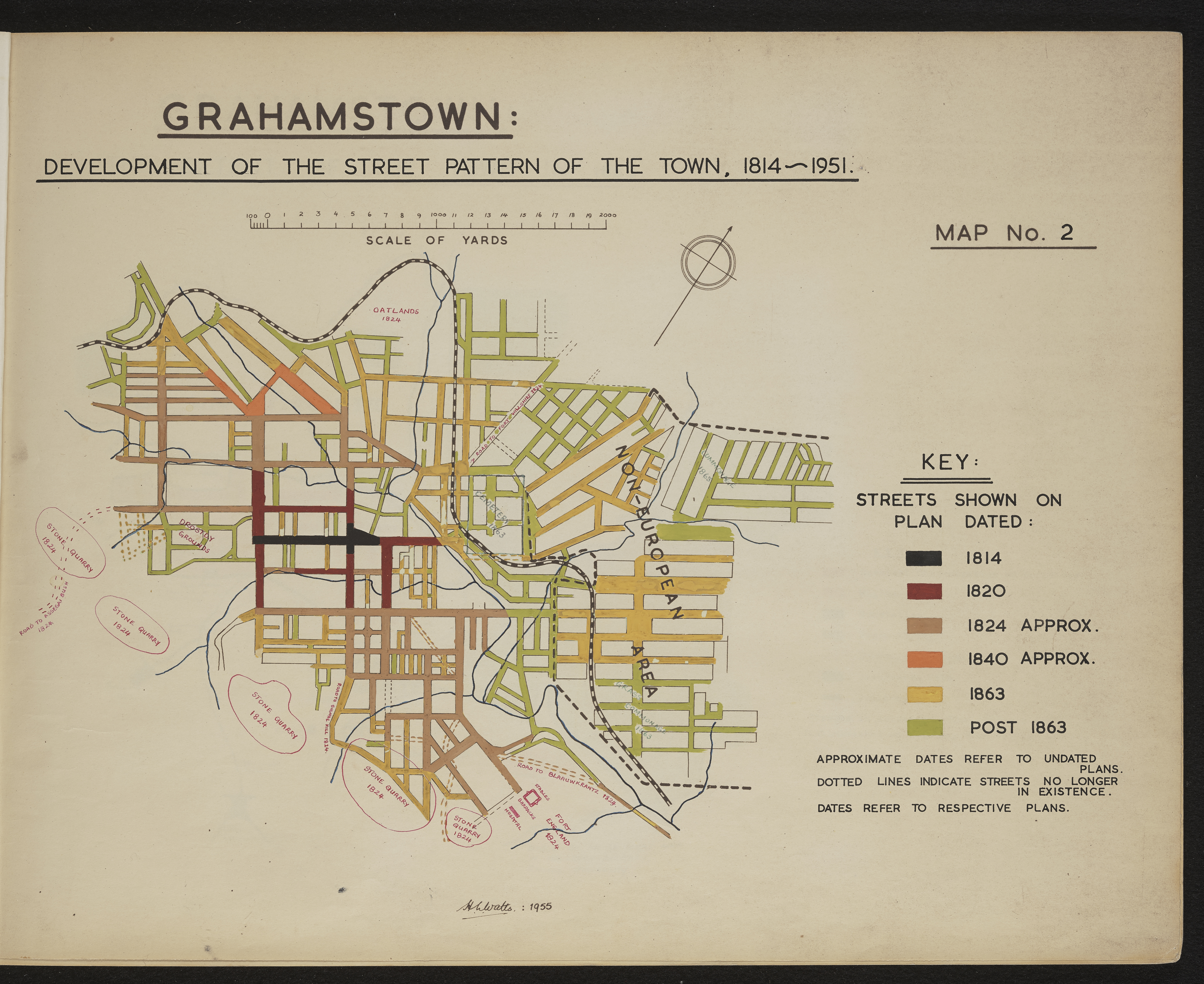 - Map 2 in the map album accompanying the thesis by Hilstan Lett Watts, "Grahamstown : a socio-ecological study of a small South African town" ; Rhodes University thesis, 1957. Map signed 1955.