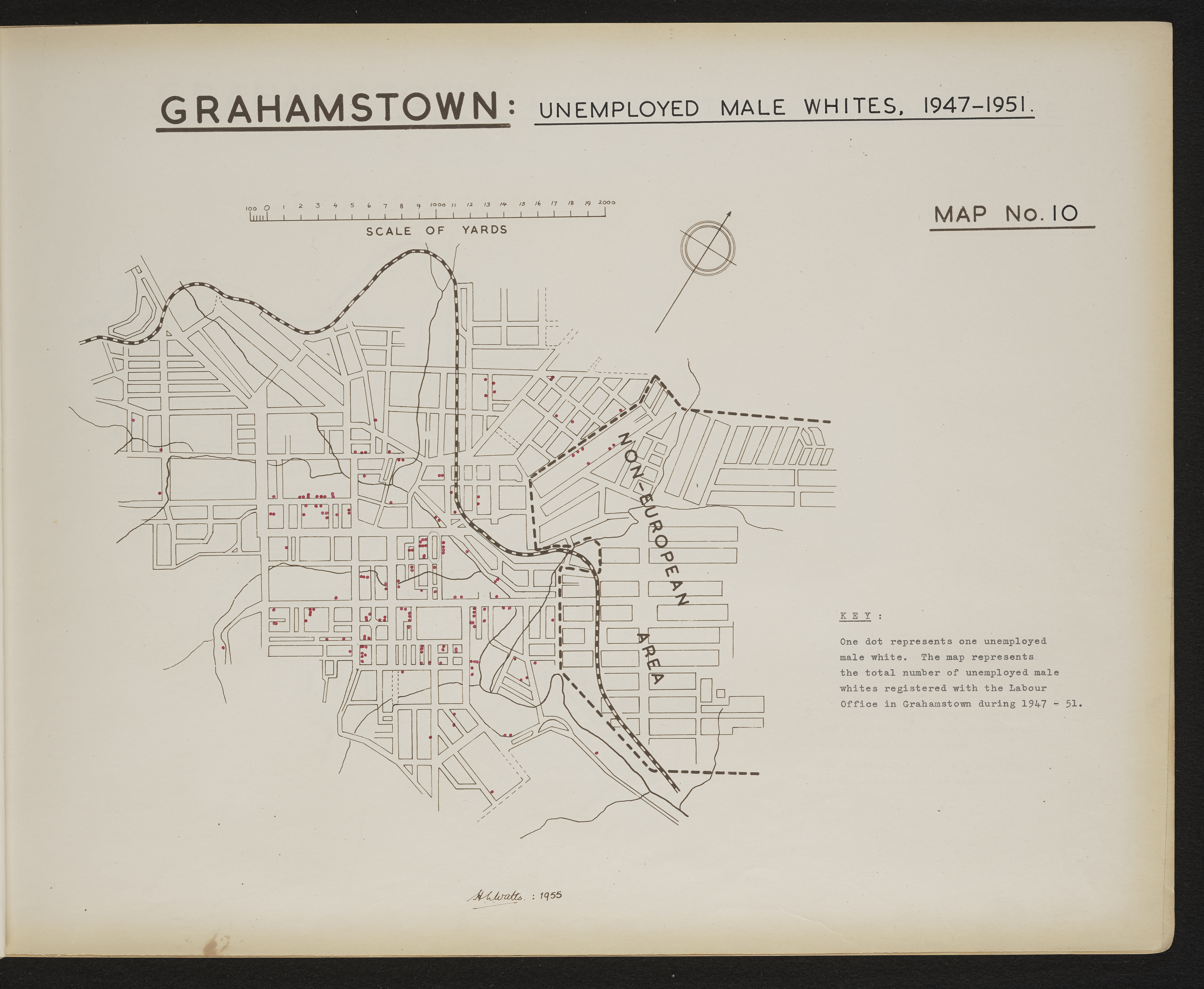 - Map 10 in the map album accompanying the thesis by Hilstan Lett Watts, "Grahamstown : a socio-ecological study of a small South African town", Rhodes University thesis, 1957. Map signed 1955. The map represents the total number of unemployed male whites registered with the Labour Office in Grahamstown during 1947-1951.