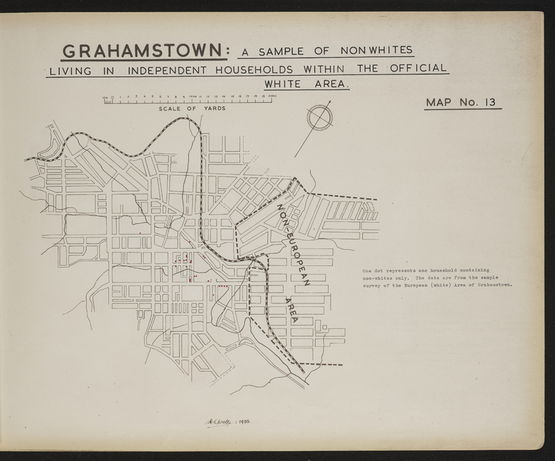 - Map 13 in the map album accompanying the thesis by Hilstan Lett Watts, "Grahamstown : a socio-ecological study of a small South African town", Rhodes University thesis, 1957. Map signed 1955. The data are from the sample survey of the European (white) area of Grahamstown.