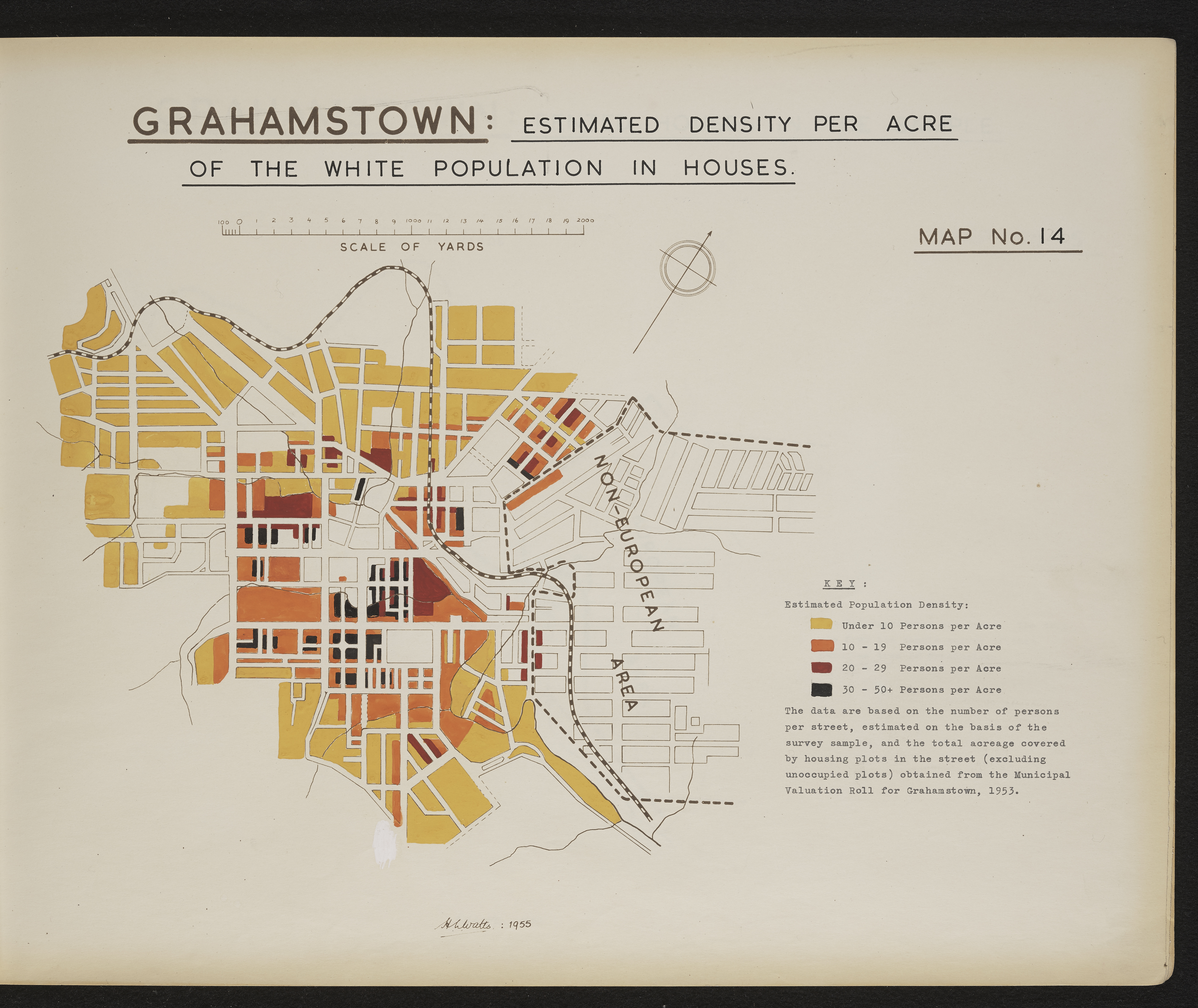 - Map 14 in the map album accompanying the thesis by Hilstan Lett Watts, "Grahamstown : a socio-ecological study of a small South African town", Rhodes University thesis, 1957. Map signed 1955. The data are based on number of persons per street, estimated on the basis of the survey sample, and the total acreage covered by housing plots in the street (excluding unoccupied plots) obtained from the municipal valuation roll for Grahamstown, 1953.