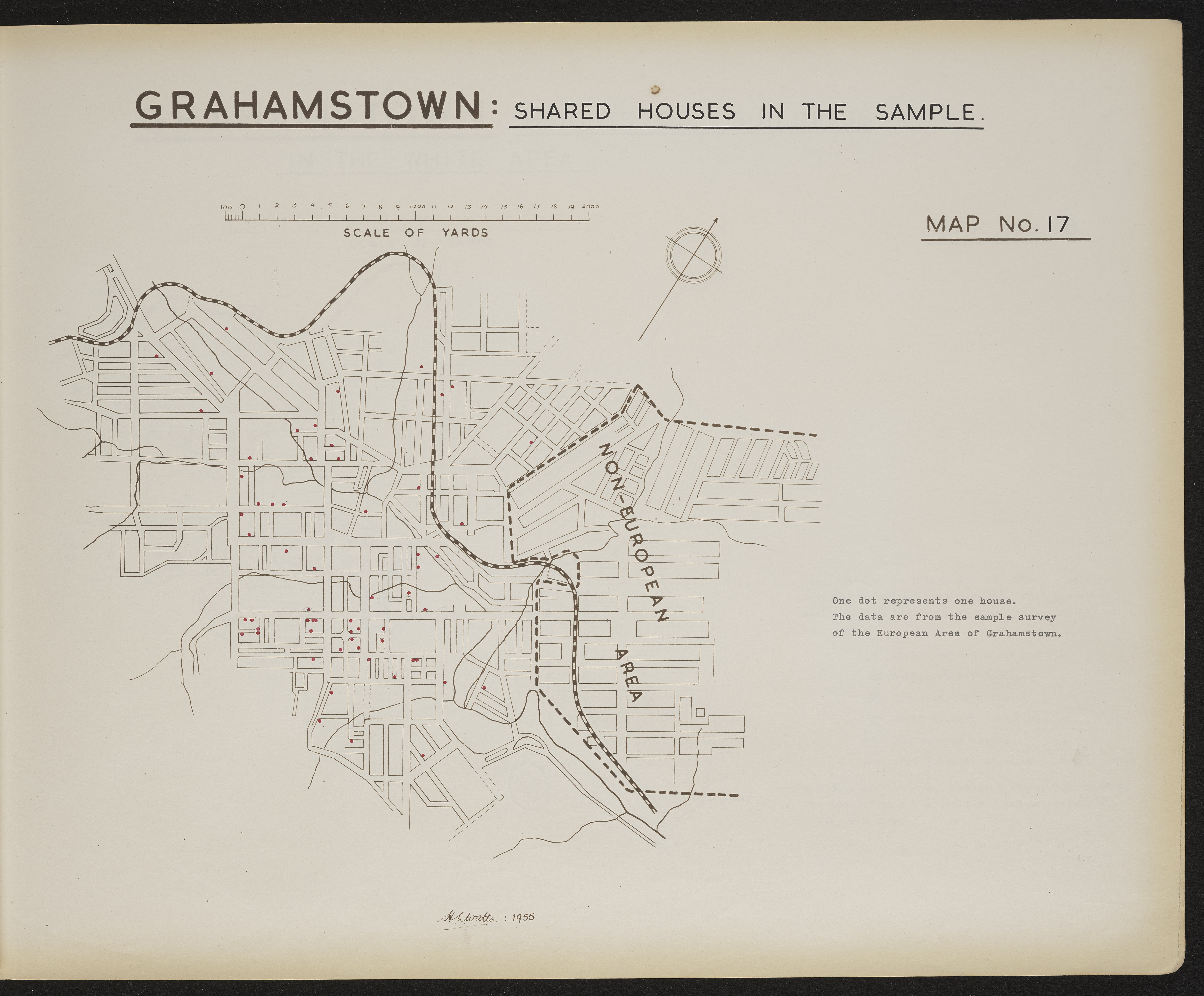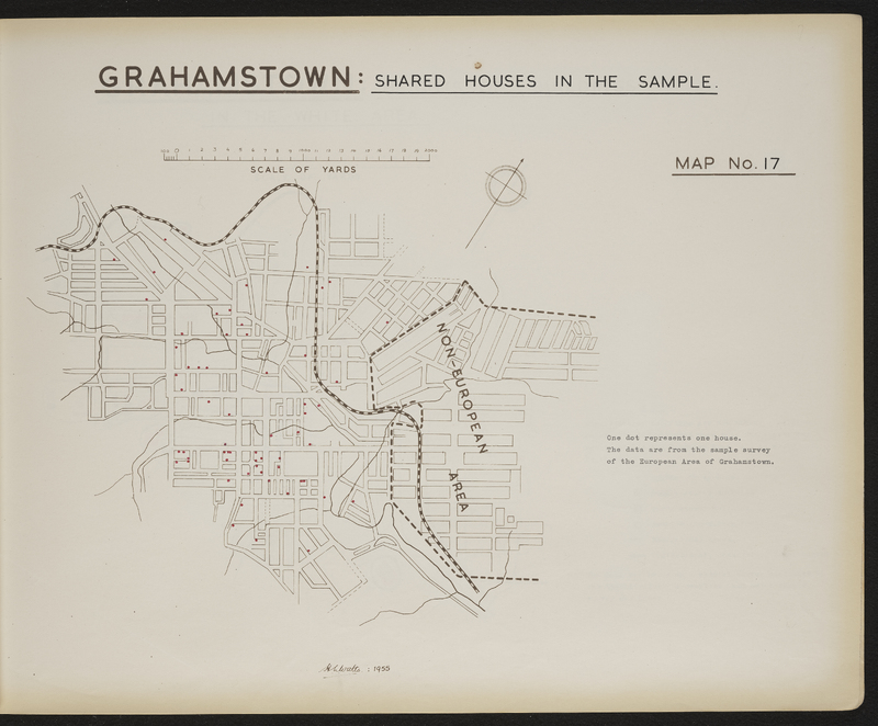 - Map 17 in the map album accompanying the thesis by Hilstan Lett Watts, "Grahamstown : a socio-ecological study of a small South African town", Rhodes University thesis, 1957. Map signed 1955. Data are from a sample survey of the European area of Grahamstown.