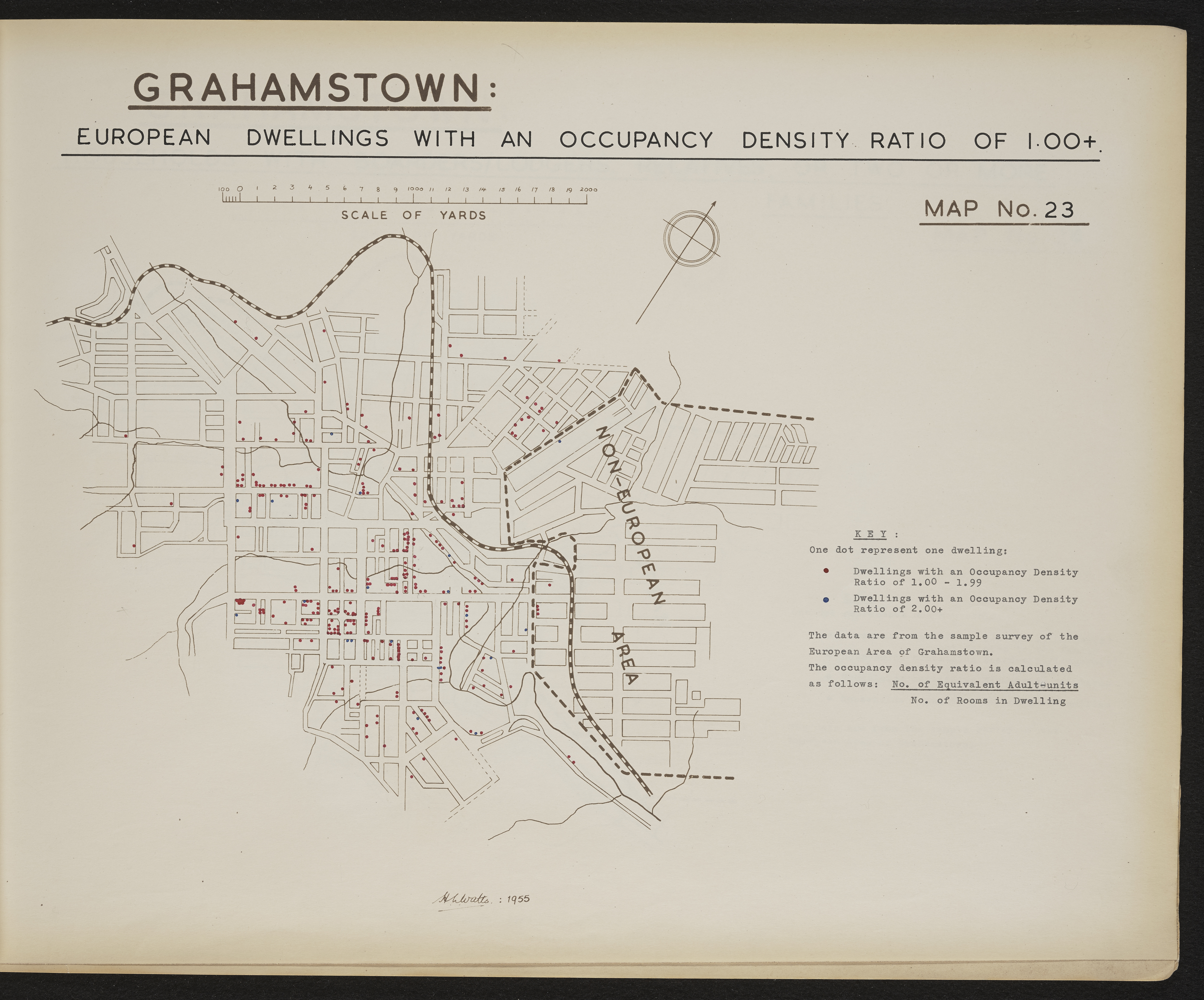 - Map 23 in the map album accompanying the thesis by Hilstan Lett Watts, "Grahamstown : a socio-ecological study of a small South African town", Rhodes University thesis, 1957. Map signed 1955. The data are from the sample survey of the European area of Grahamstown