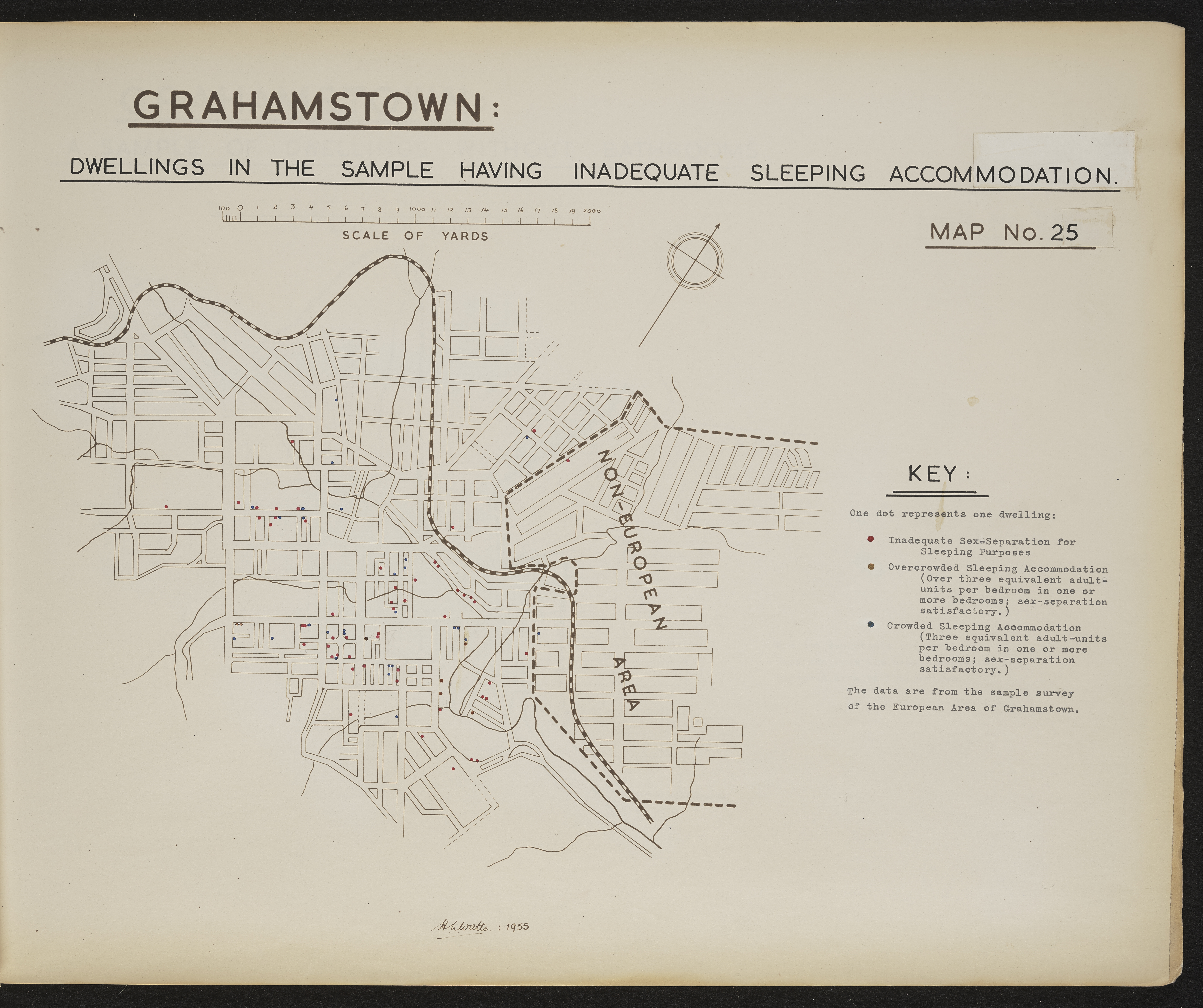- Map 25 in the map album accompanying the thesis by Hilstan Lett Watts, "Grahamstown : a socio-ecological study of a small South African town", Rhodes University thesis, 1957. Map signed 1955. The data are from the sample survey of the European area of Grahamstown.