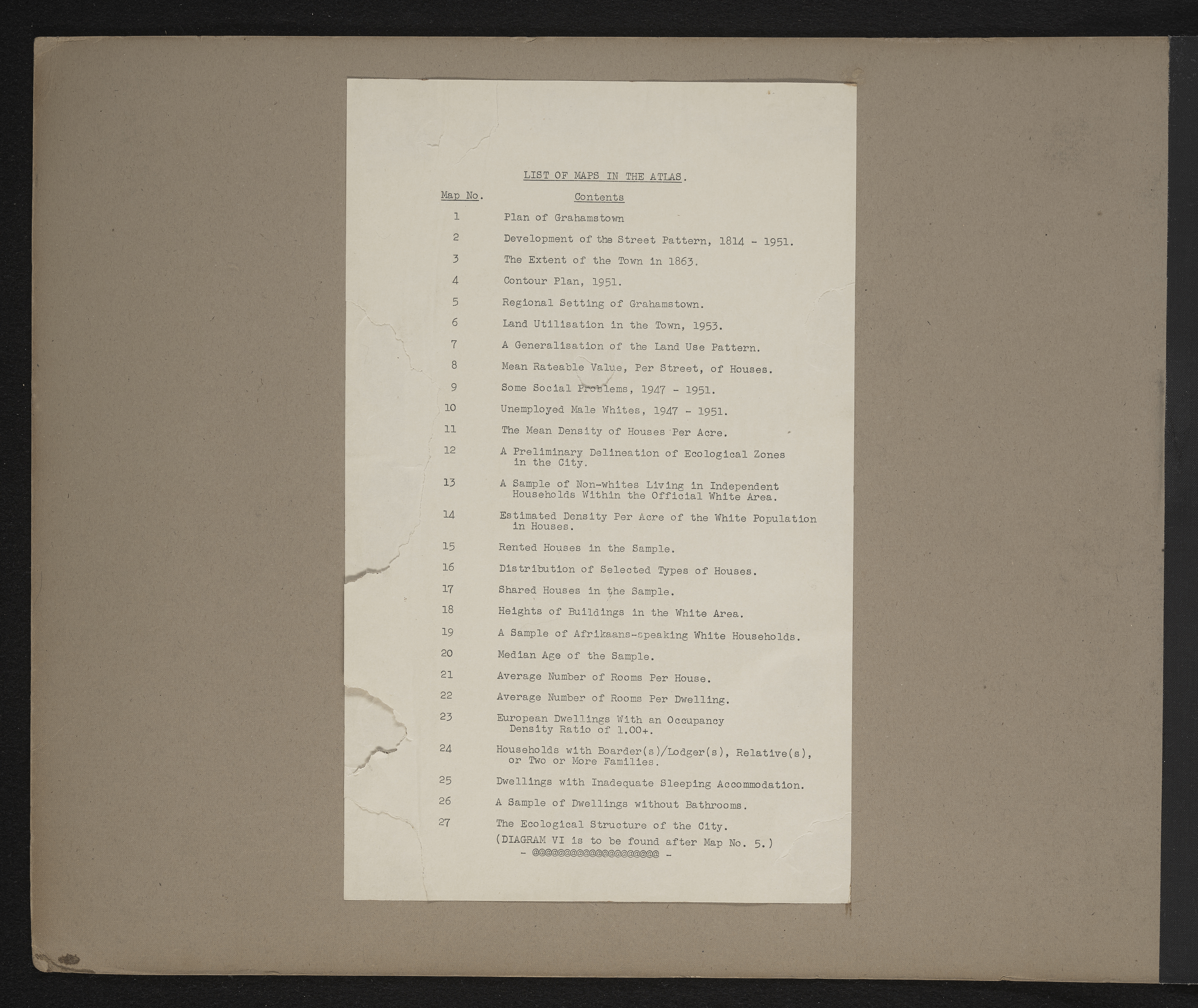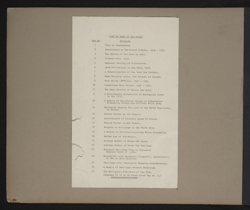 - List of maps in the map album accompanying the thesis by Hilstan Lett Watts, "Grahamstown : a socio-ecological study of a small South African town", Rhodes University thesis, 1957.