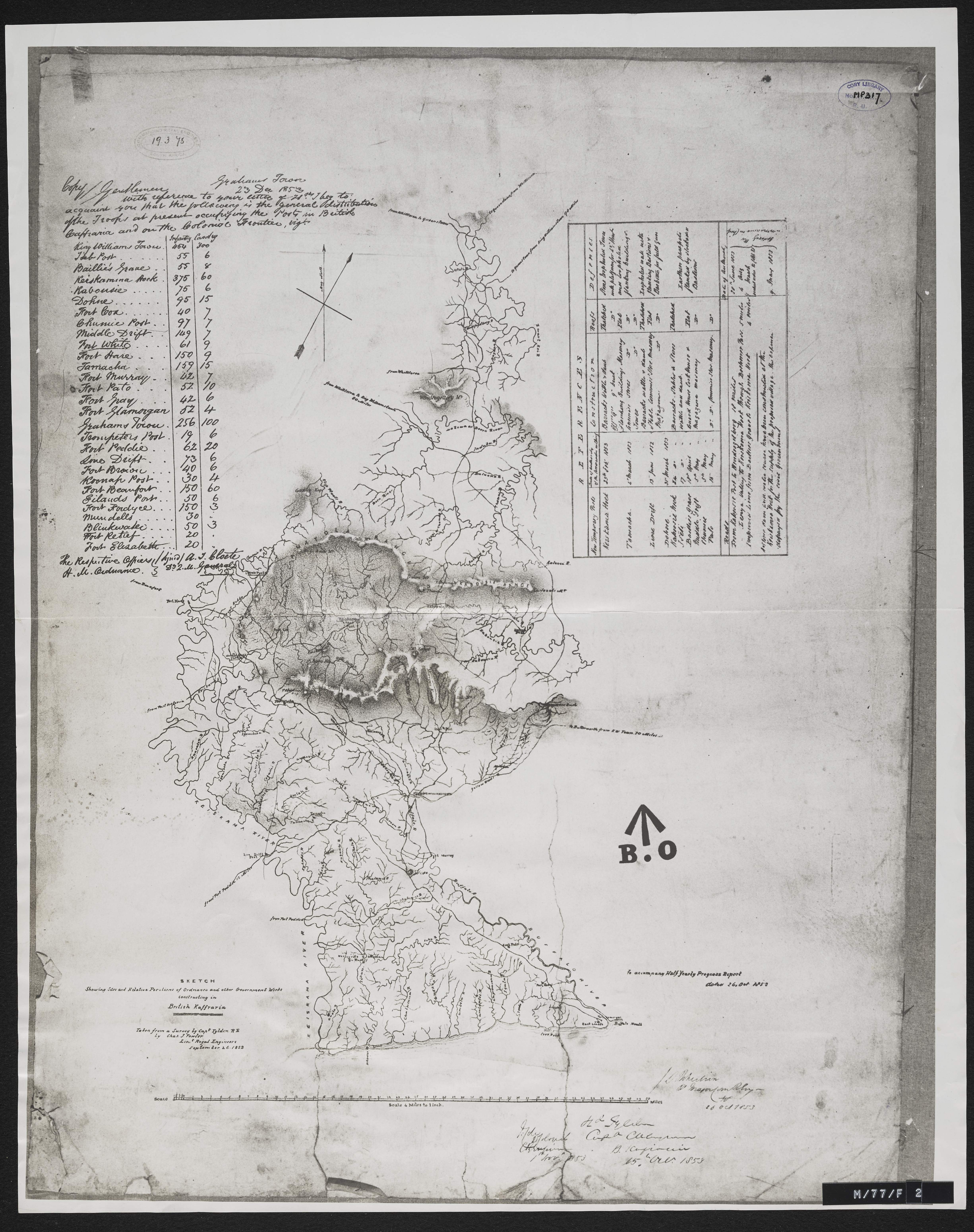 Tylden, Richard, 1819-1855,Fawler, Charles J, “Sketch shewing the sites and relative positions of Ordinance and other Government works constructed in British Kaffraria (incl. notes on the construction of new posts and and distribution of troops at the posts) ; taken from a survey by Capt. Tylden by Chas J. Fawler, R.W., LieutRoyal Engineers, 26th Sept. 1853.”, Cory Library and Historical Archives, accessed 29 December 2025, https://digitalarchives.ru.ac.za/s/cory/item/10823