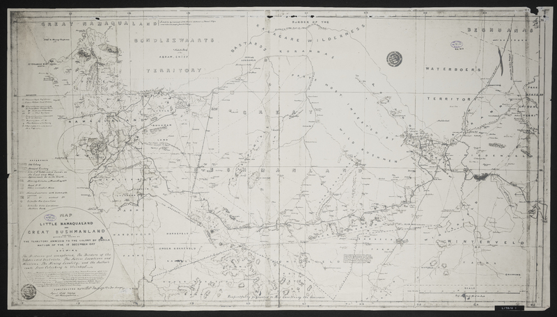 Moffat, Robert, 1827-1862, “Map of Little Namaqualand and Great Bushmanland together, otherwise known as the terribory annexed to the Colony by proclamation of 17 December 1847 shewing the portions yet unexplored, the borders of the subdivided districts, the native locations and missions, the mining locality and the author's route from Colesburg to Steinkopf”, Cory Library and Historical Archives, accessed 29 December 2025, https://digitalarchives.ru.ac.za/s/cory/item/10825