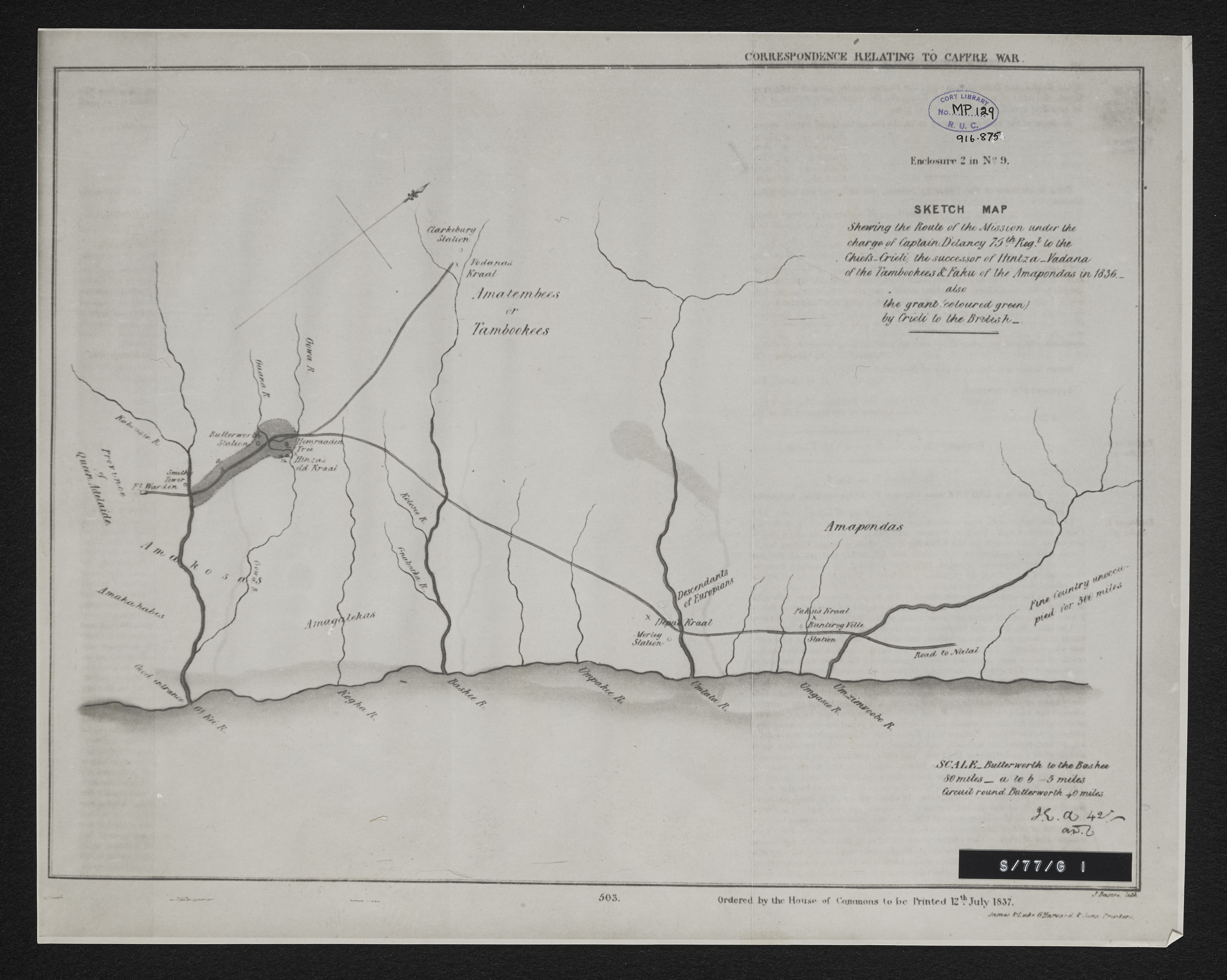 Great Britain. Parliament. House of Commons, “Sketch map shewing the route of the mission under the change of Captain Delancy, 75th Regt. to the chiefs Creli - the successor to Hintza - Vadana of the Tambookies and Faku of the Amapondas in 1836 - also the grant (coloured green) by Crieli to the British”, Cory Library and Historical Archives, accessed 29 December 2025, https://digitalarchives.ru.ac.za/s/cory/item/10839