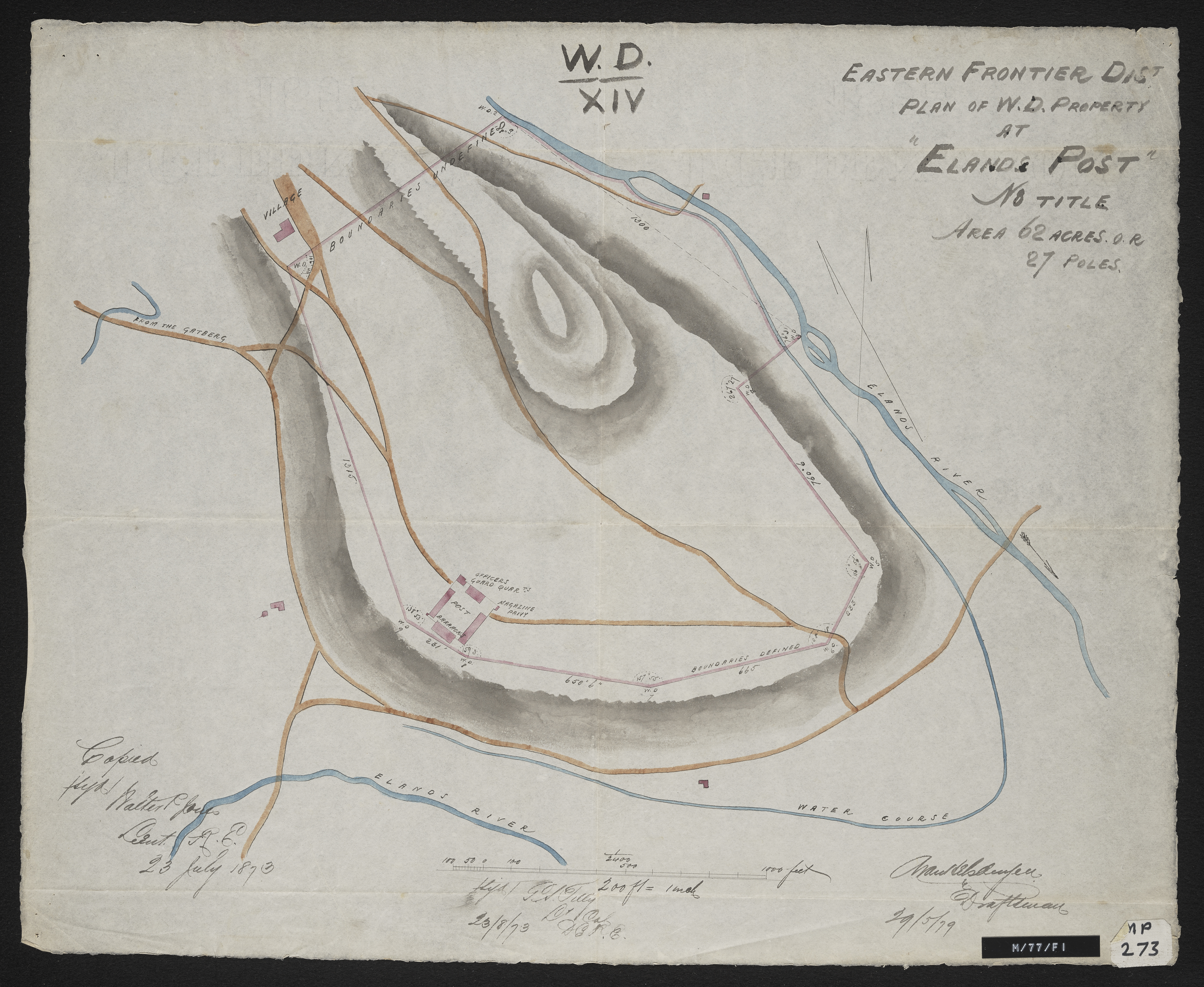Great Britain. War Office,Jones, Walter P, “Eastern Frontier Dist. plan of W.D. property at Eland's Post,Eastern Frontier District plan of War Department property at Eland's Post”, Great Britain. War Office, Cory Library and Historical Archives, accessed 28 December 2025, https://digitalarchives.ru.ac.za/s/cory/item/10851