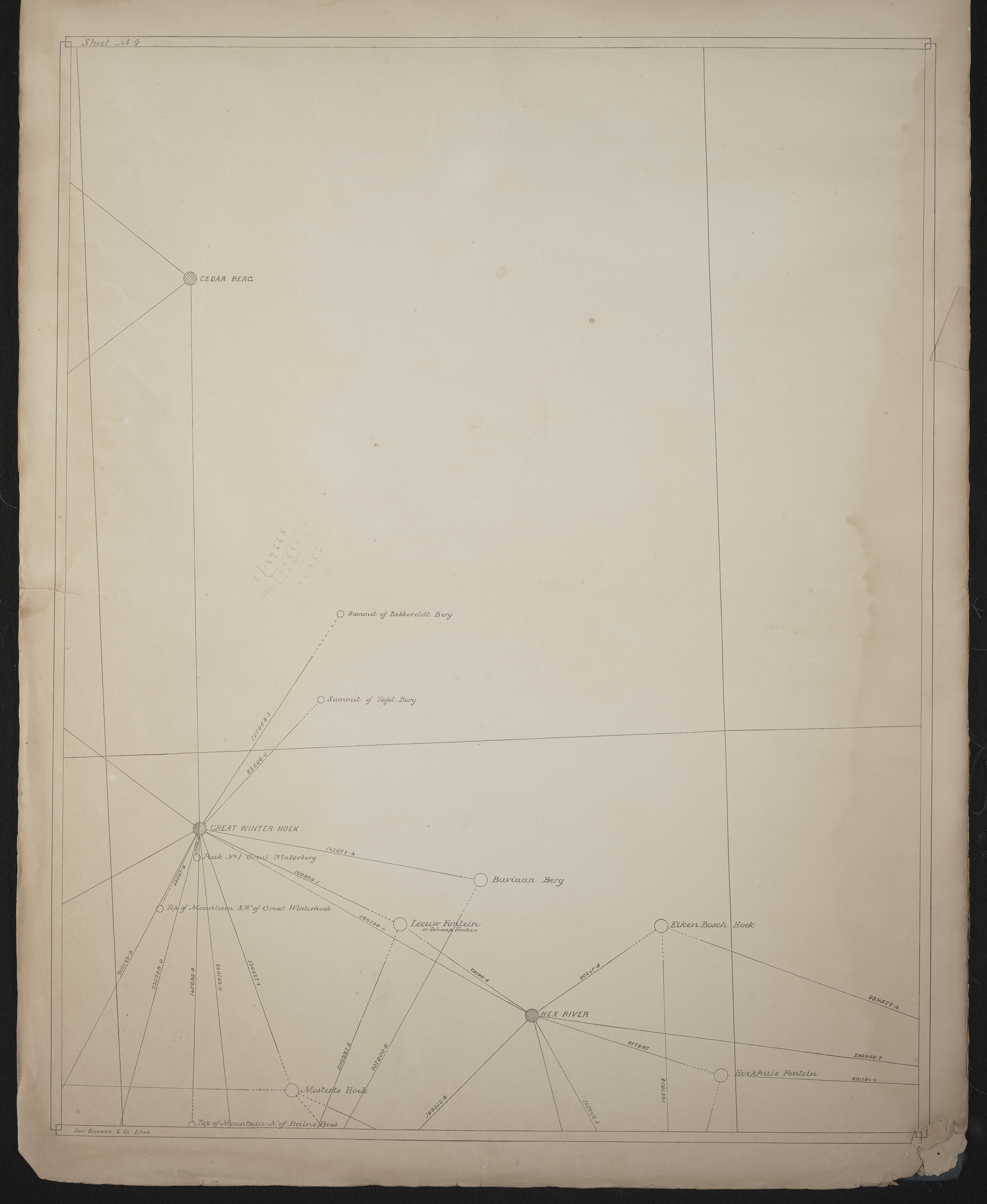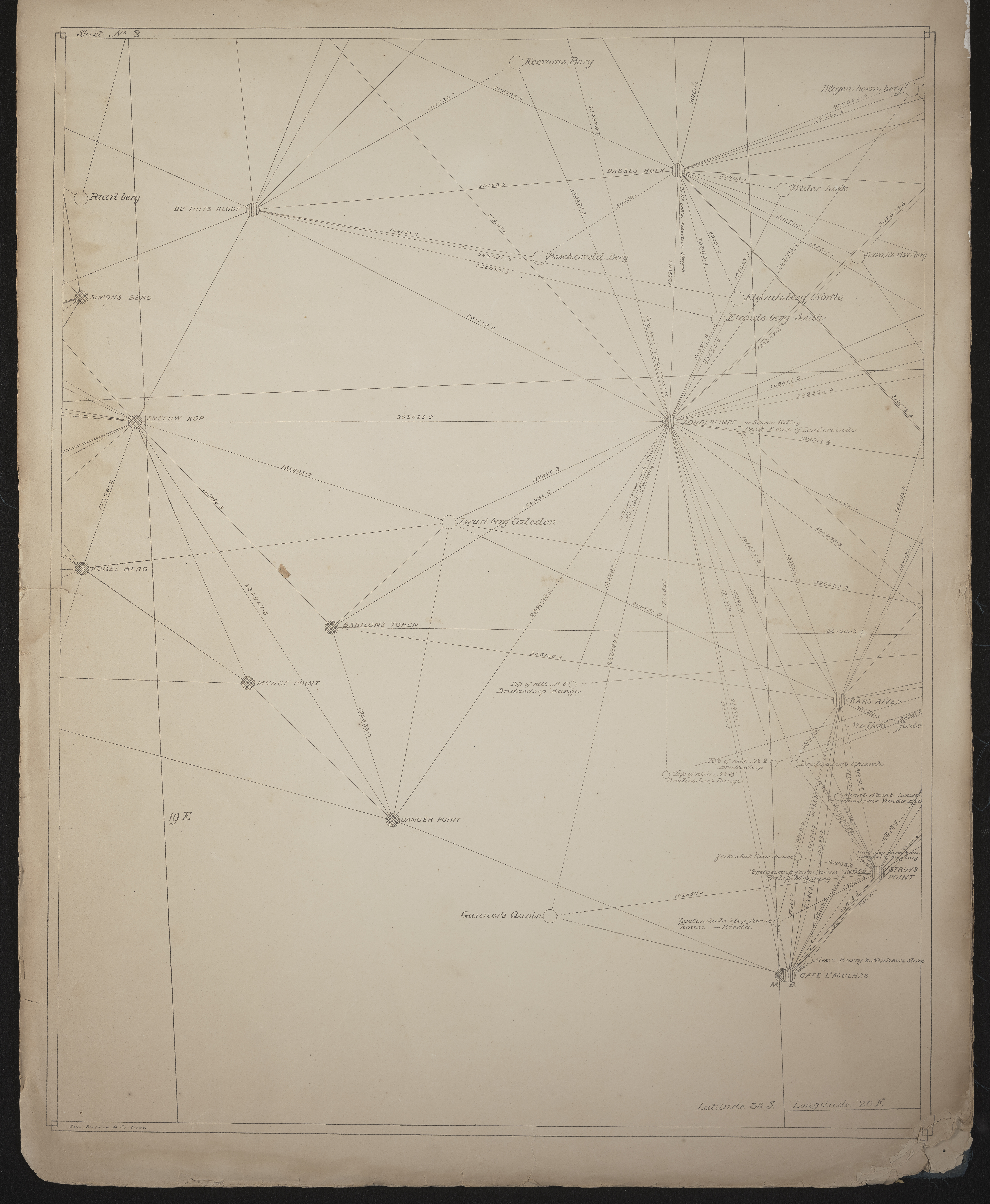 Bailey, William, Captain, “General plan of the triangulation of the southern part of the Cape Colony 1859.1862”, Saul Solomon and Co., Cory Library and Historical Archives, accessed 29 December 2025, https://digitalarchives.ru.ac.za/s/cory/item/10879