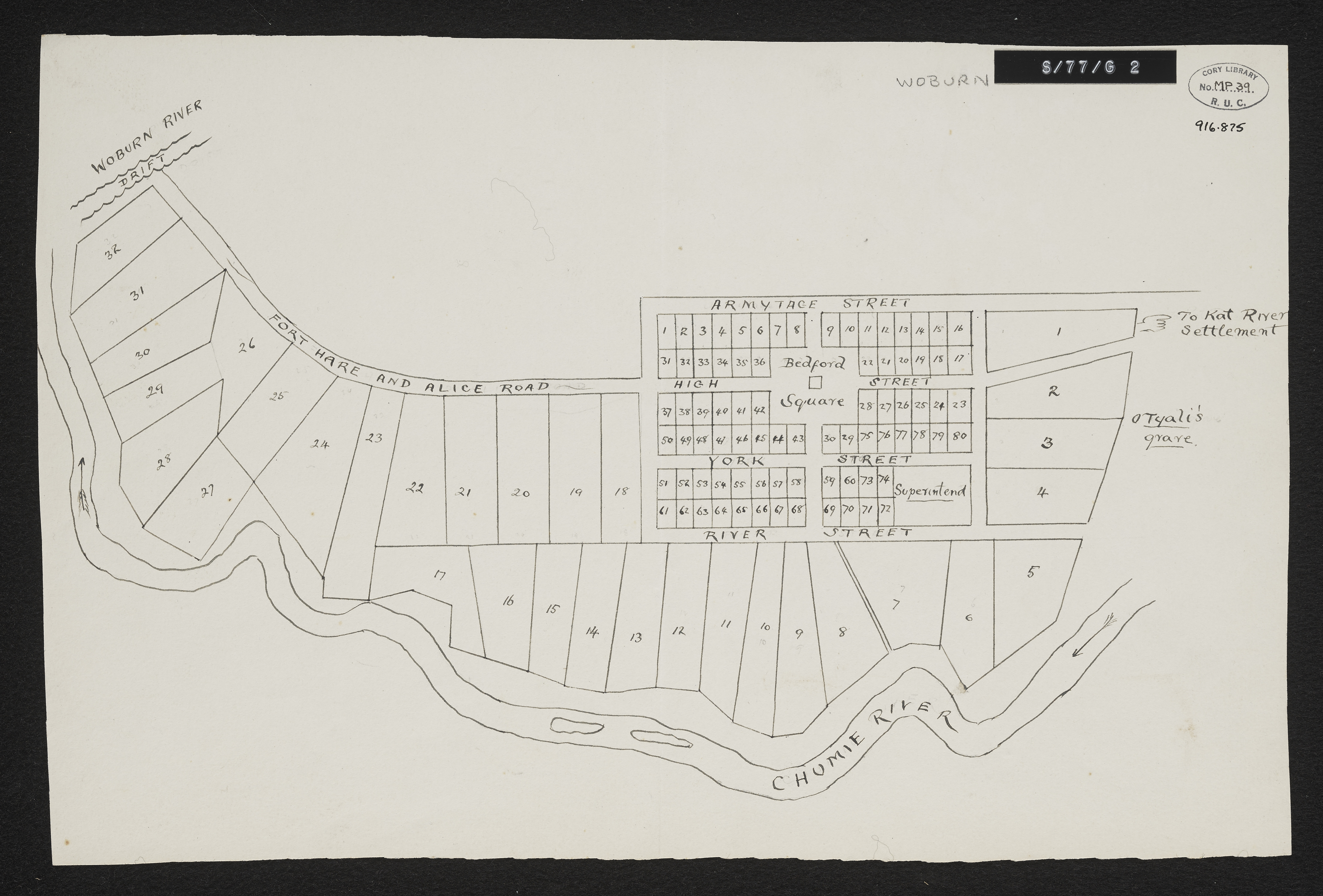 - Woburn Military Village. No date on map but probably around 1848. Unsigned plan in some detail of the village, possibly as it was projected rather than as it actually appeared. Scale not stated. 1 sheet 14" x 9". Manuscript. From Sir George Cory's papers.