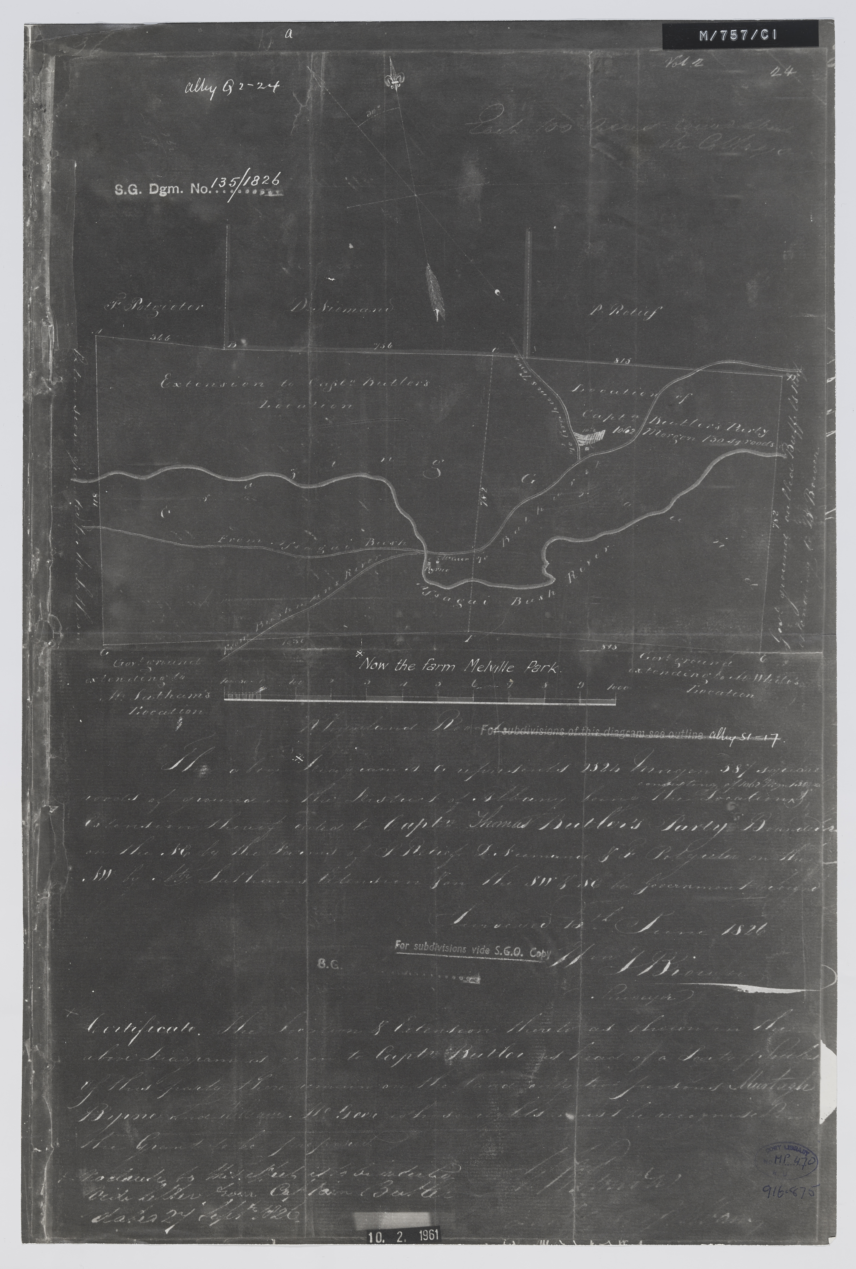 - Diagram of the location … and extension thereof ceded to Capt. Thomas Butler's party, now the farm Melville Park, in the district of Albany; surveyed 13th June 1826 [by] Wm. J. Brown. Photo negative.