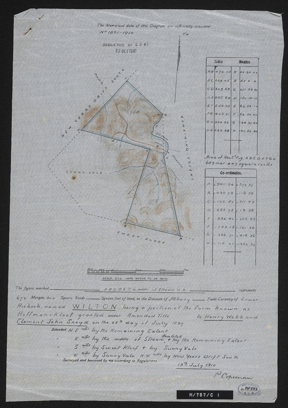 - Diagram of the farm Wilton, being a portion of the farm known as Hoffman's Kloof, granted under amended title to Henry Webb and Clement John Sneyd on the 26th day of July 1897, surveyed and beaconed by me according to regulations 19th July 1910. P. Coperman. In the Division of Albany, Field Cornetcy of Lower Riebeek.