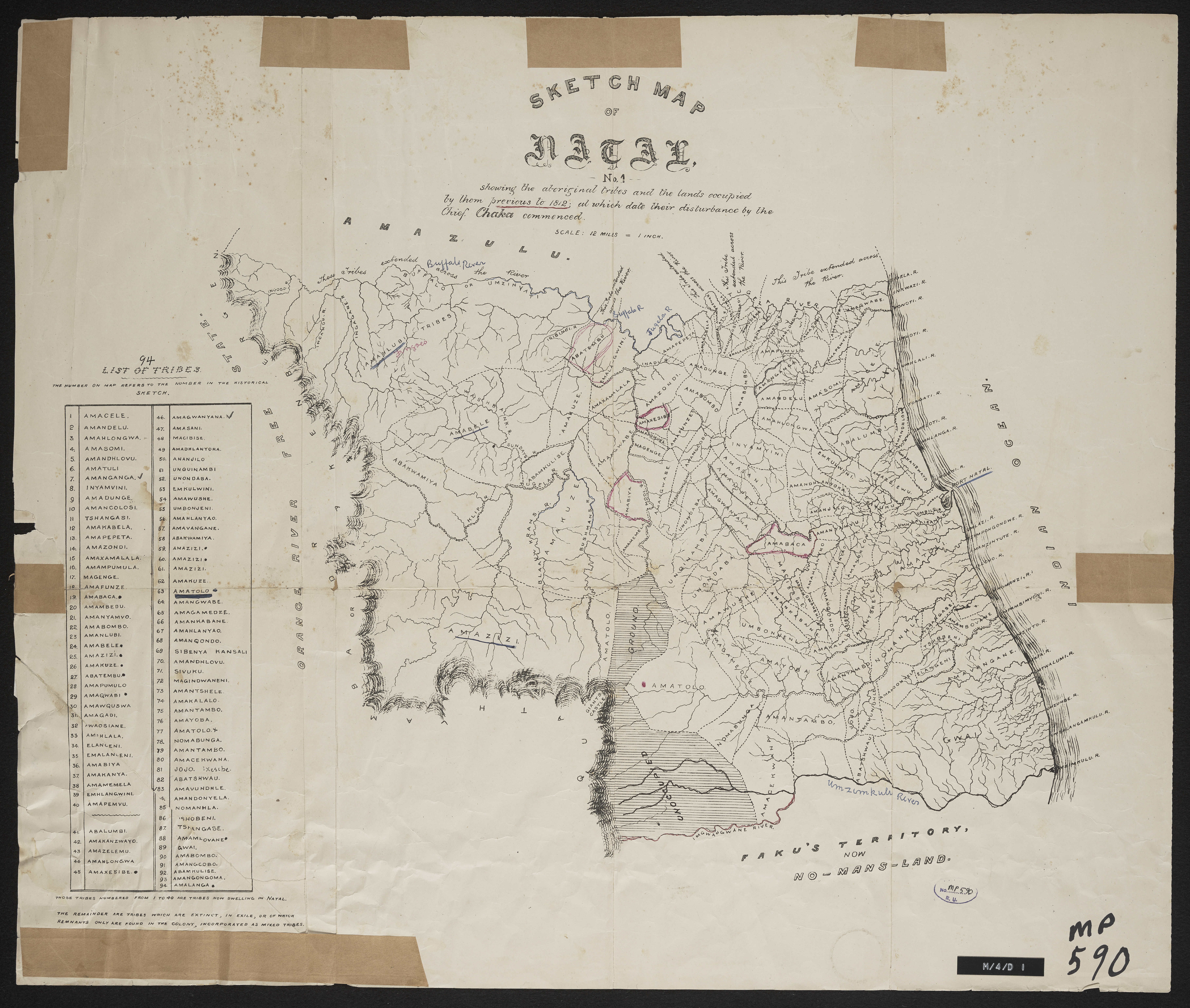 - Sketch map of Natal No. 1 showing the aboriginal tribes and the lands occupied by them previous to 1812, at which date their disturbance by the Chief Chaka commenced ; [1864]. Key contains a list of 94 tribes which originally occupied KwaZulu Natal.