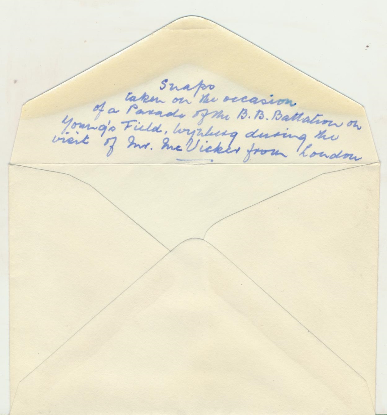 - Boys' Brigade Parade at the event of a visit from William McVicker. Handwritten description on the flap of envelope received containing photo of Capt. Arendse and Mr. McVicker: "Snaps taken on the occasion of a parade of the B.B. Bettalion on Young's Field, Wynberg during the visit of Mr. McVicker from London".