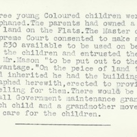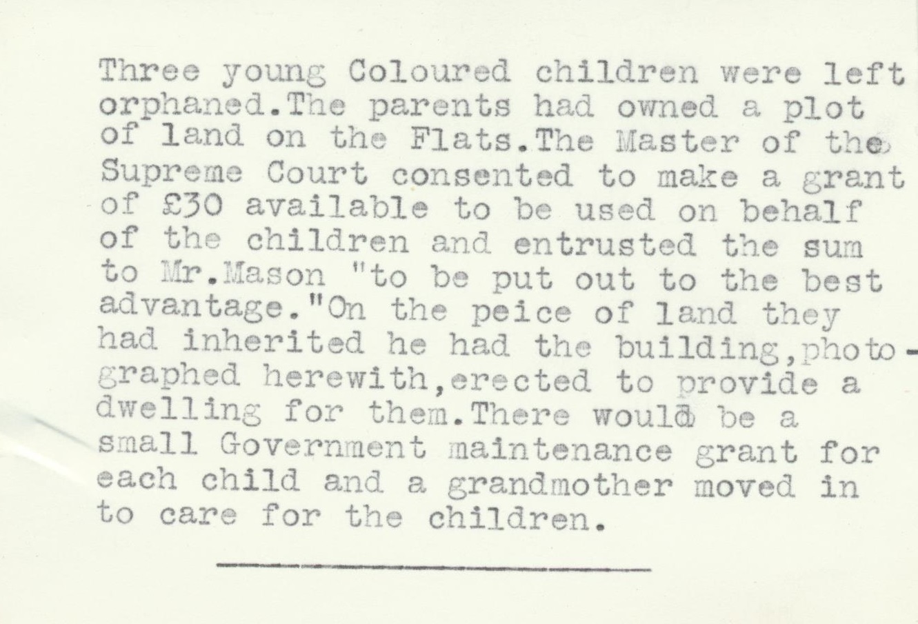 - Transcription: "Three young Coloured children were left orphaned. The parents had owned a [plot of land on the Flats. The Master of the Supreme Court consented to make a grant of £30 available to be used on behalf of the children and entrusted the sum to Mr. Mason "to be put out to the best advantage." On the piece of land of land they had inherited he had the building, photographed herewith, erected to provide a dwelling for them. There would be a small Government maintenance grant for each child and a grandmother moved in to care for the children".