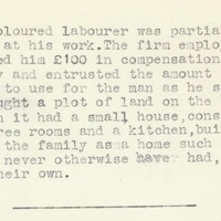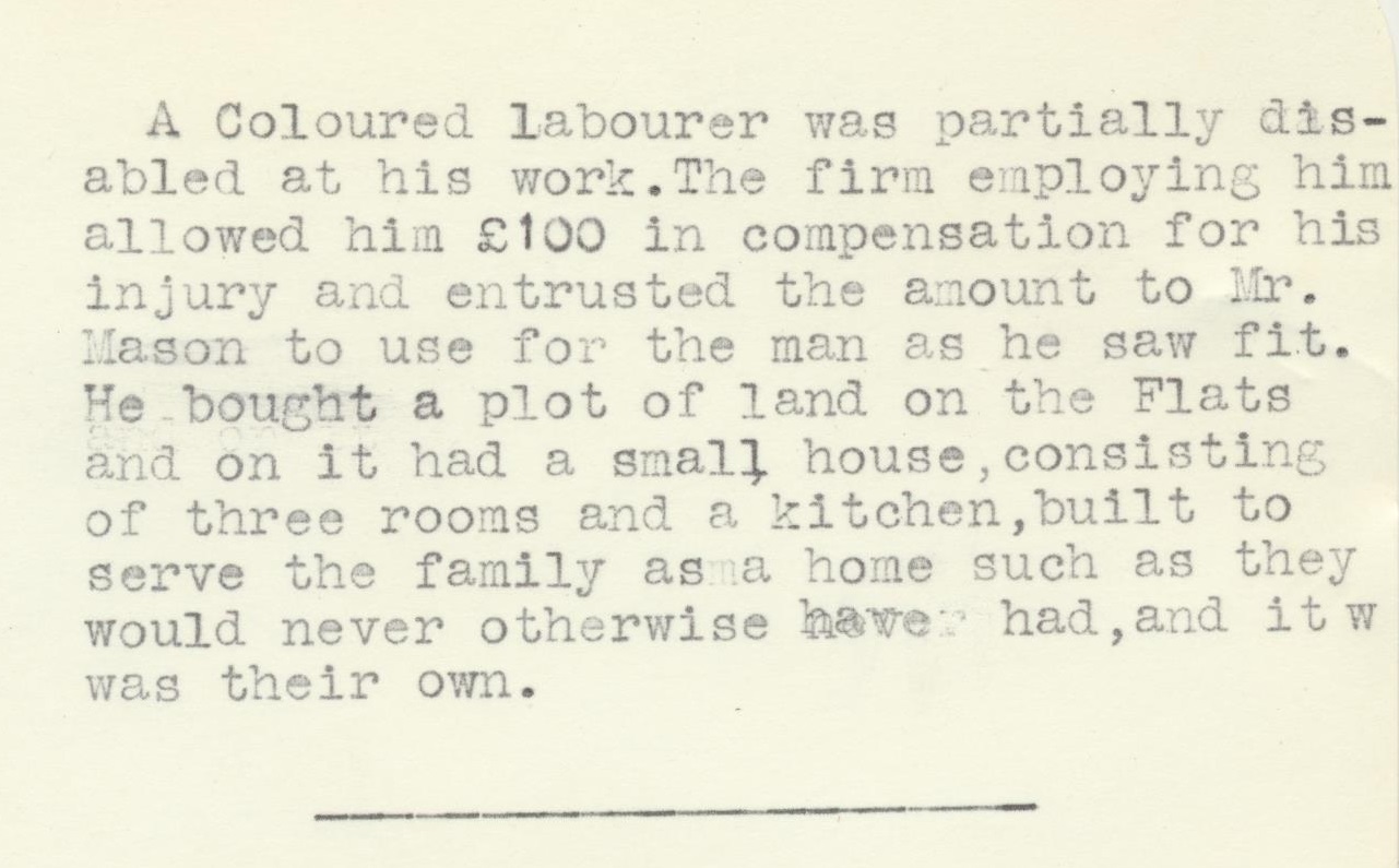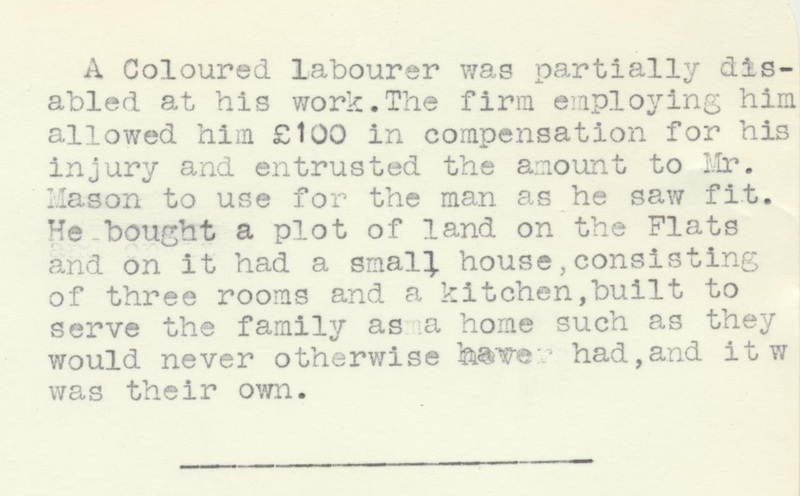 - Transcript: "A Coloured labourer was partially disabled at his work. The firm employing him allowed him £100 in compensation for his injury and entrusted the amount to Mr. Mason to use for the man as he saw fit. He brought a plot of land on the Flats and on it had a small house, consisting of three rooms and a kitchen, built to serve the family as a home such as they would never otherwise had, and it was their own."