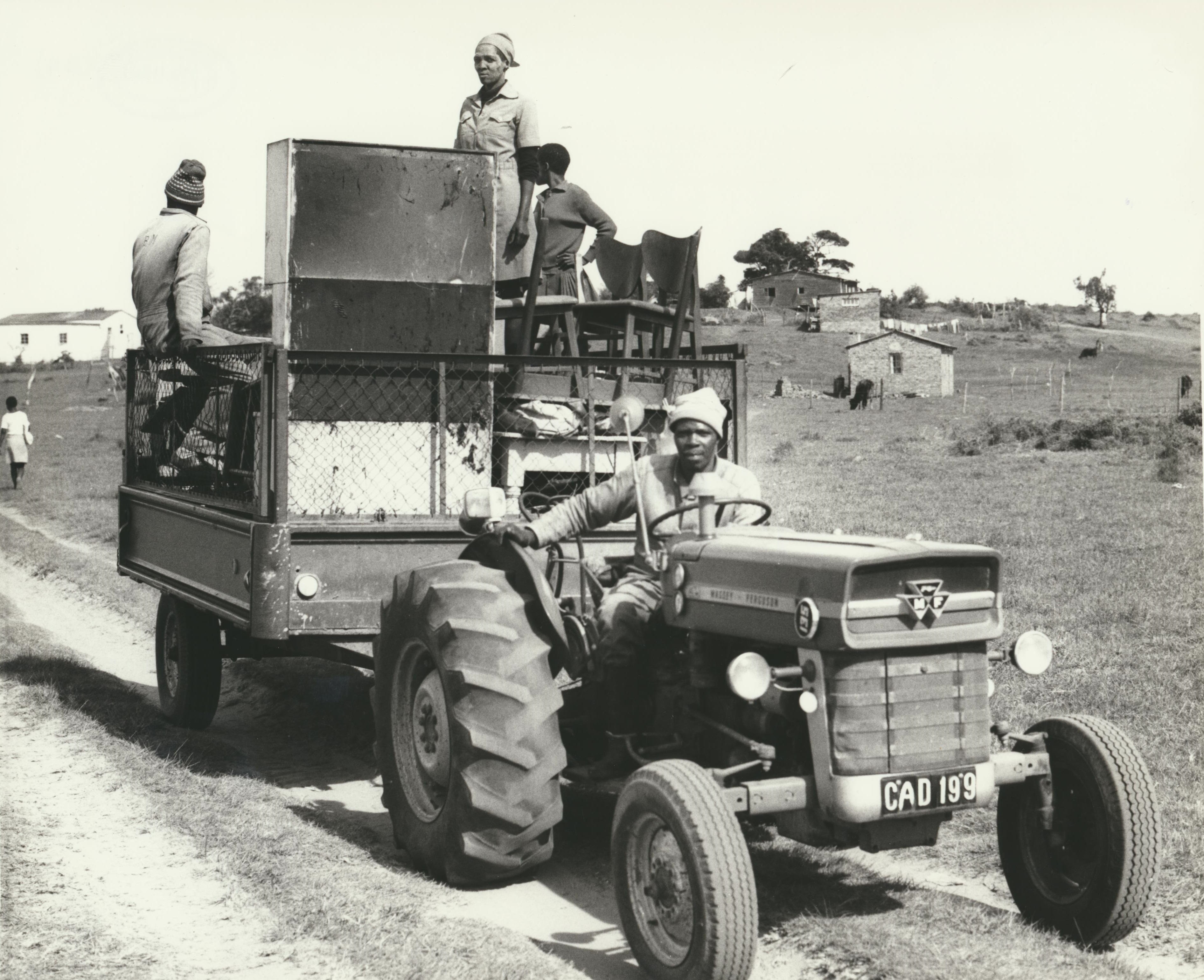 - A series of photographs showing views of forced removal of communities from Klipfontein farm, near Kenton-on-sea, and other areas, to Glenmore in 1979. These photographs were accumulated by Ben Maclennan when he worked as a journalist for Eastern Province Herald, covering the move, and when he wrote the book "Glenmore : the story of a forced romoval" This photograph showing Klipfontein residents in a tractor, together with their belongings taken to Glenmore. Photograph taken by Jack Cooper in 1979