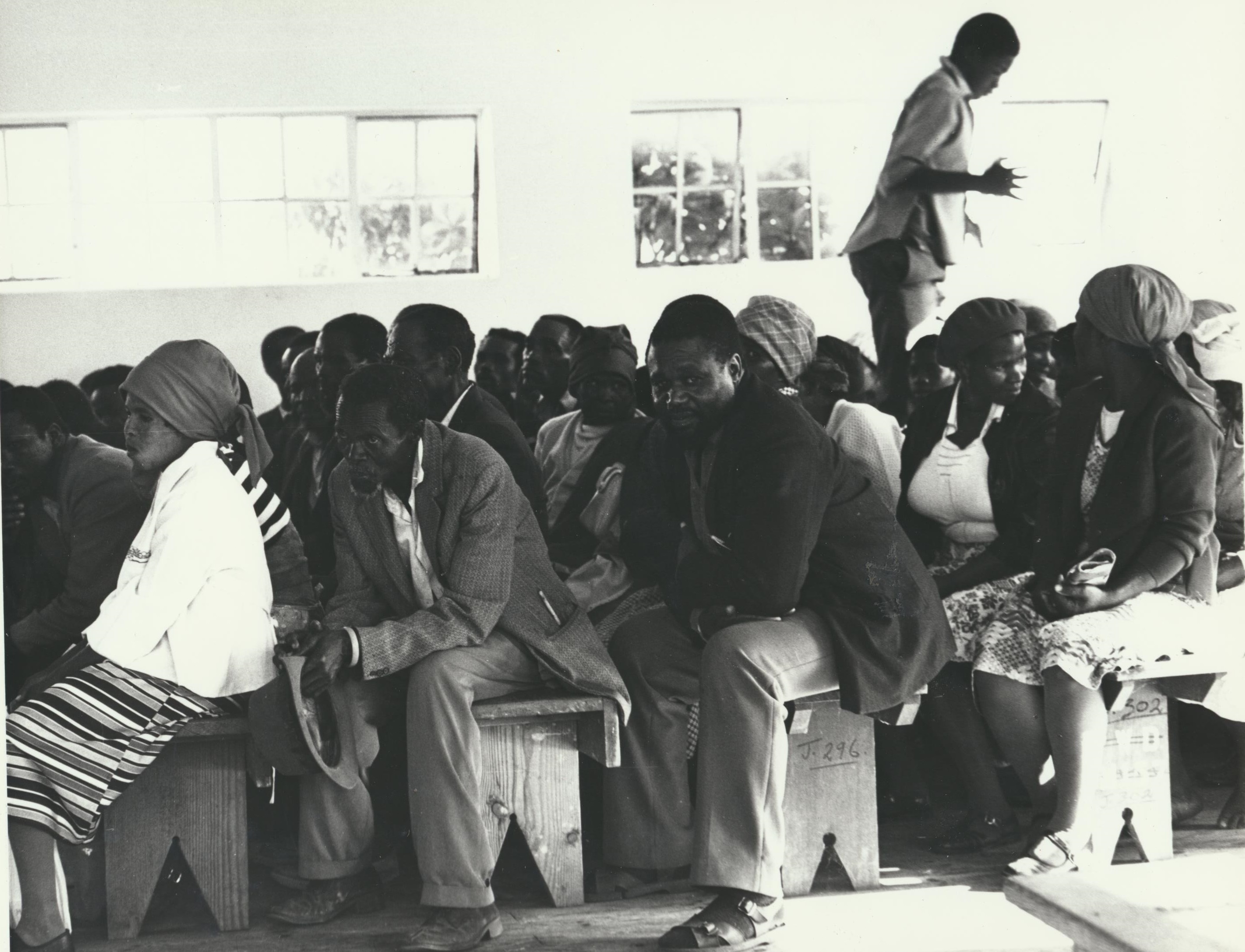 - Photographs taken at the time of the Klipfontein evictions, the resultant trial at the Supreme Court Grahamstown, and the eventual settlement of those evicted in the Glenmore resettlement location, showing some of the residents involved, officials, members of the press, as well as aerial and on site views of Glenmore. Photographers: Dave Forbes, Ben Maclennan, Evert Smith, and an unknown photographer. This photograph shows people sitting on benches during a court case or meeting