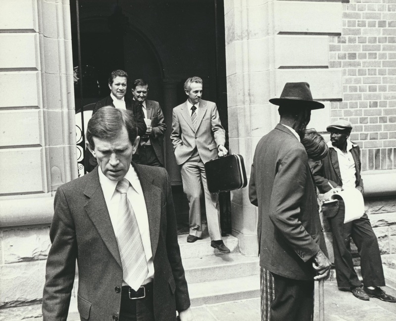 - A series of photographs taken at the time of the Klipfontein evictions, the resultant trial at the Supreme Court Grahamstown, and the eventual settlement of those evicted in the Glenmore resettlement location, showing some of the residents involved, officials, members of the press, as well as aerial and on site views of Glenmore. Photographers: Dave Forbes, Ben Maclennan, Evert Smith, and an unknown photographer. This photograph shows Mr Louis Koch leaves the supreme court in Grahamstown after the setting aside of Mr Van der Watt's eviction order. Behind Mr Koch, from left: Advocate van Rensburg, Mr Dennis Bush, Mr van der Watt (top)