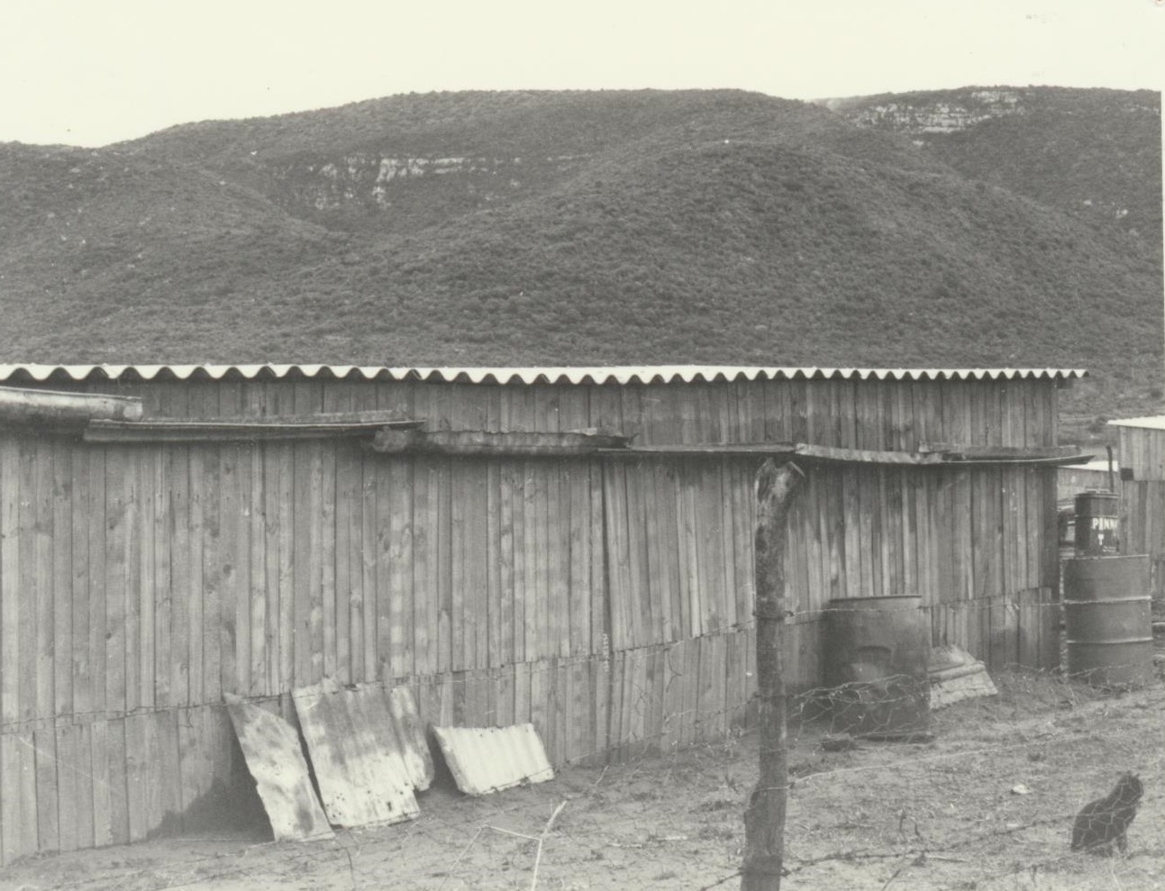 - A series of photographs taken at the time of the Klipfontein evictions, the resultant trial at the Supreme Court Grahamstown, and the eventual settlement of those evicted in the Glenmore resettlement location, showing some of the residents involved, officials, members of the press, as well as aerial and on site views of Glenmore. Photographers: Dave Forbes, Ben Maclennan, Evert Smith, and an unknown photographer. This photograph shows back of a wooden shack, temporary houses built for Glenmore people after they were removed from Klipfontein