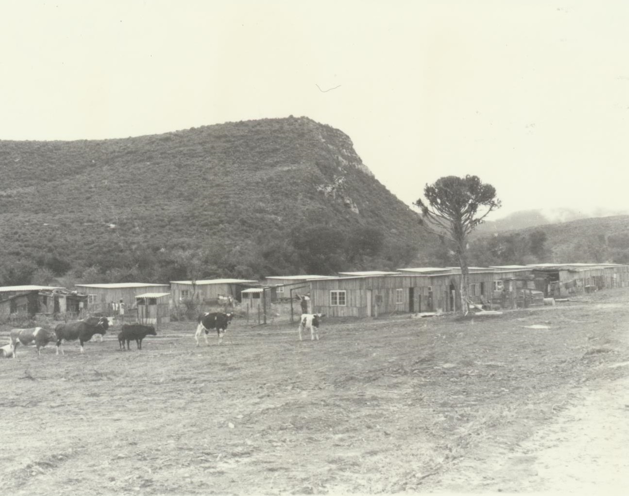 - A series of photographs taken at the time of the Klipfontein evictions, the resultant trial at the Supreme Court Grahamstown, and the eventual settlement of those evicted in the Glenmore resettlement location, showing some of the residents involved, officials, members of the press, as well as aerial and on site views of Glenmore. Photographers: Dave Forbes, Ben Maclennan, Evert Smith, and an unknown photographer. This photograph shows wooden shacks, temporary houses built for Glenmore people after they were removed from different places in the Eastern Cape, including Klipfontein