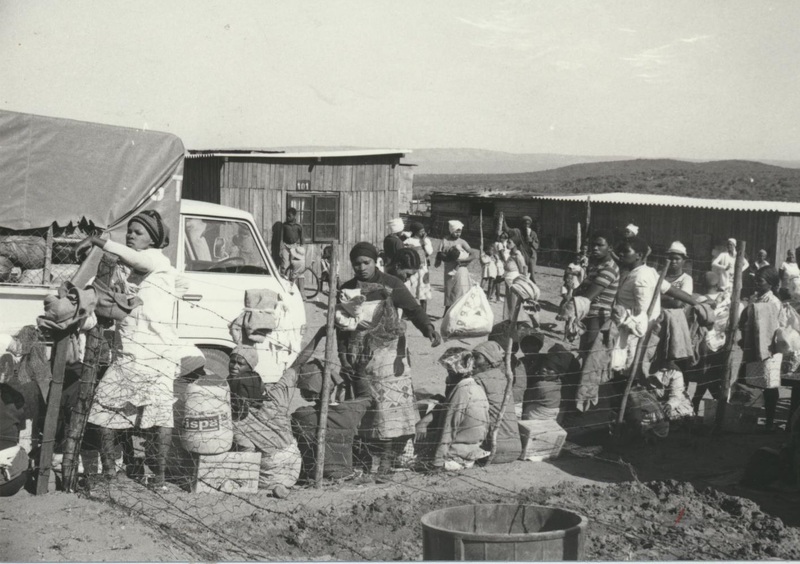 - A series of photographs taken at the time of the Klipfontein evictions, the resultant trial at the Supreme Court Grahamstown, and the eventual settlement of those evicted in the Glenmore resettlement location, showing some of the residents involved, officials, members of the press, as well as aerial and on site views of Glenmore. Photographers: Dave Forbes, Ben Maclennan, Evert Smith, and an unknown photographer. This photograph shows Glenmore locals standing next to fence, queueing for food rations - truck and shack in background.
