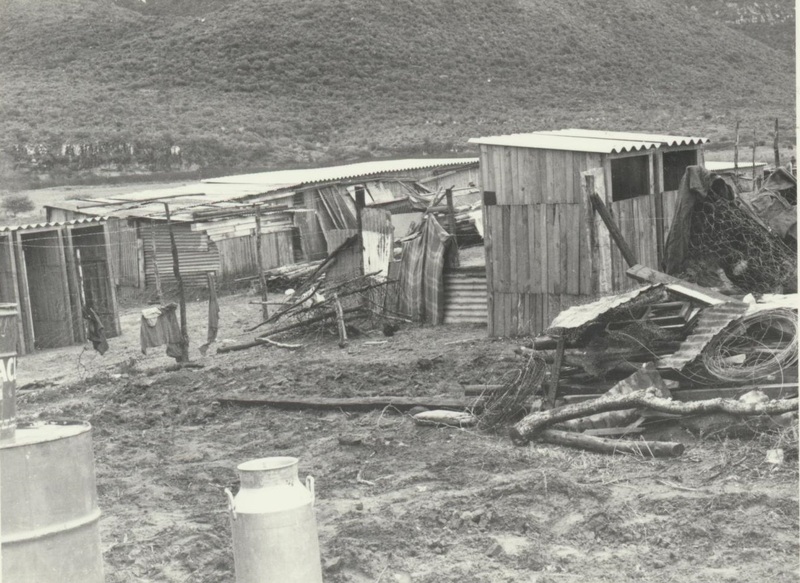 - A series of photographs taken at the time of the Klipfontein evictions, the resultant trial at the Supreme Court Grahamstown, and the eventual settlement of those evicted in the Glenmore resettlement location, showing some of the residents involved, officials, members of the press, as well as aerial and on site views of Glenmore. Photographers: Dave Forbes, Ben Maclennan, Evert Smith, and an unknown photographer. This photograph shows how an outside yard would looked like in Glenmore, with tin toilets and tree branches, perhaps used as firewood or for fencing.