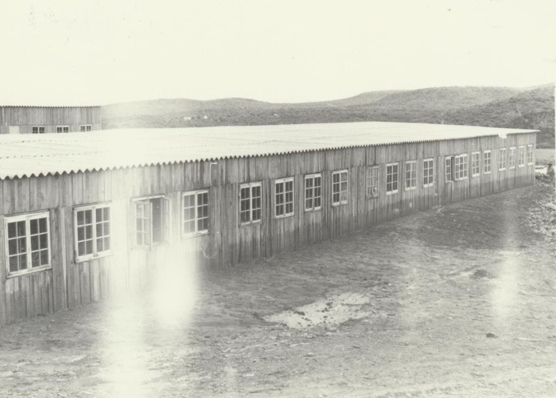 - A series of photographs taken at the time of the Klipfontein evictions, the resultant trial at the Supreme Court Grahamstown, and the eventual settlement of those evicted in the Glenmore resettlement location, showing some of the residents involved, officials, members of the press, as well as aerial and on site views of Glenmore. Photographers: Dave Forbes, Ben Maclennan, Evert Smith, and an unknown photographer. This photograph shows a wooden building with many windows, possibly a hostel or school in Glenmore
