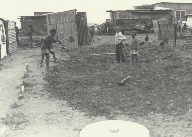 - A series of photographs taken at the time of the Klipfontein evictions, the resultant trial at the Supreme Court Grahamstown, and the eventual settlement of those evicted in the Glenmore resettlement location, showing some of the residents involved, officials, members of the press, as well as aerial and on site views of Glenmore. Photographers: Dave Forbes, Ben Maclennan, Evert Smith, and an unknown photographer. This photograph shows children in Glenmore, working in the garden infront of their houses