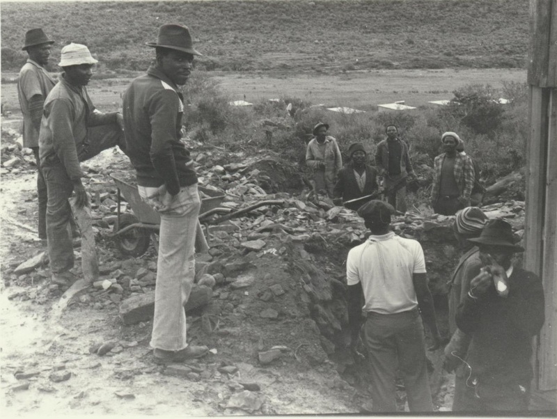 - A series of photographs taken at the time of the Klipfontein evictions, the resultant trial at the Supreme Court Grahamstown, and the eventual settlement of those evicted in the Glenmore resettlement location, showing some of the residents involved, officials, members of the press, as well as aerial and on site views of Glenmore. Photographers: Dave Forbes, Ben Maclennan, Evert Smith, and an unknown photographer. This photograph shows a group of men in Glenmore digging a hole, probably a grave. When the evicted people arrived in Glenmore, a number of them became sick, there were no jobs, only poverty and that there was no clinic for people to get medication. People started dying.