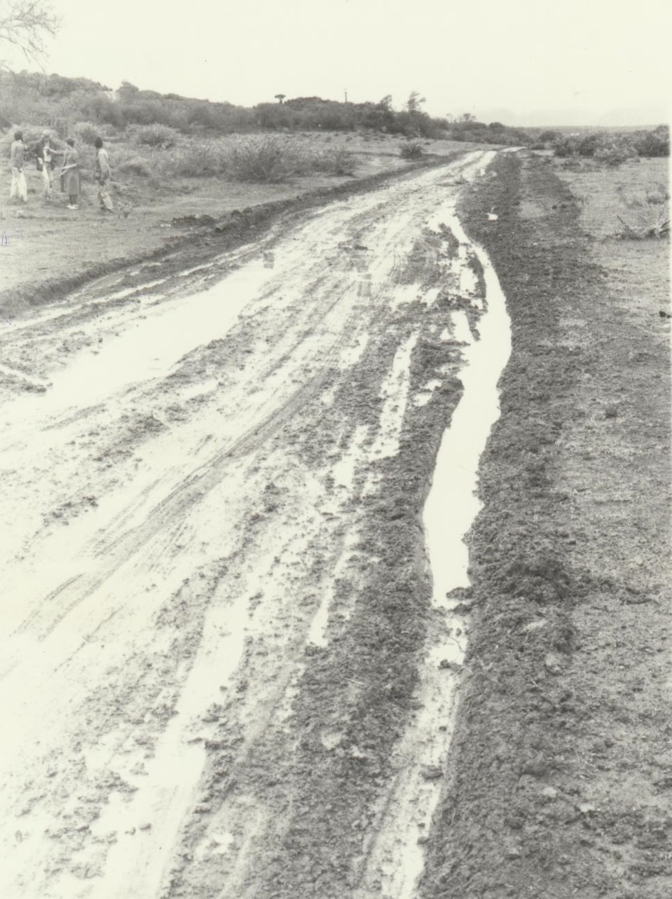- A series of photographs taken at the time of the Klipfontein evictions, the resultant trial at the Supreme Court Grahamstown, and the eventual settlement of those evicted in the Glenmore resettlement location, showing some of the residents involved, officials, members of the press, as well as aerial and on site views of Glenmore. Photographers: Dave Forbes, Ben Maclennan, Evert Smith, and an unknown photographer. This photograph shows a muddy road leading to Glenmore, with four pressman or newspaper journalists standing on the side of the road.