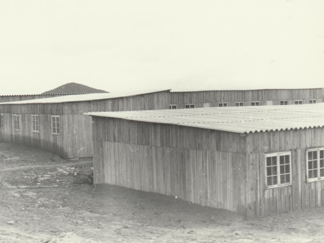 - A series of photographs taken at the time of the Klipfontein evictions, the resultant trial at the Supreme Court Grahamstown, and the eventual settlement of those evicted in the Glenmore resettlement location, showing some of the residents involved, officials, members of the press, as well as aerial and on site views of Glenmore. Photographers: Dave Forbes, Ben Maclennan, Evert Smith, and an unknown photographer. This photograph shows wooden buildings with many windows, possibly a hostel or school in Glenmore.