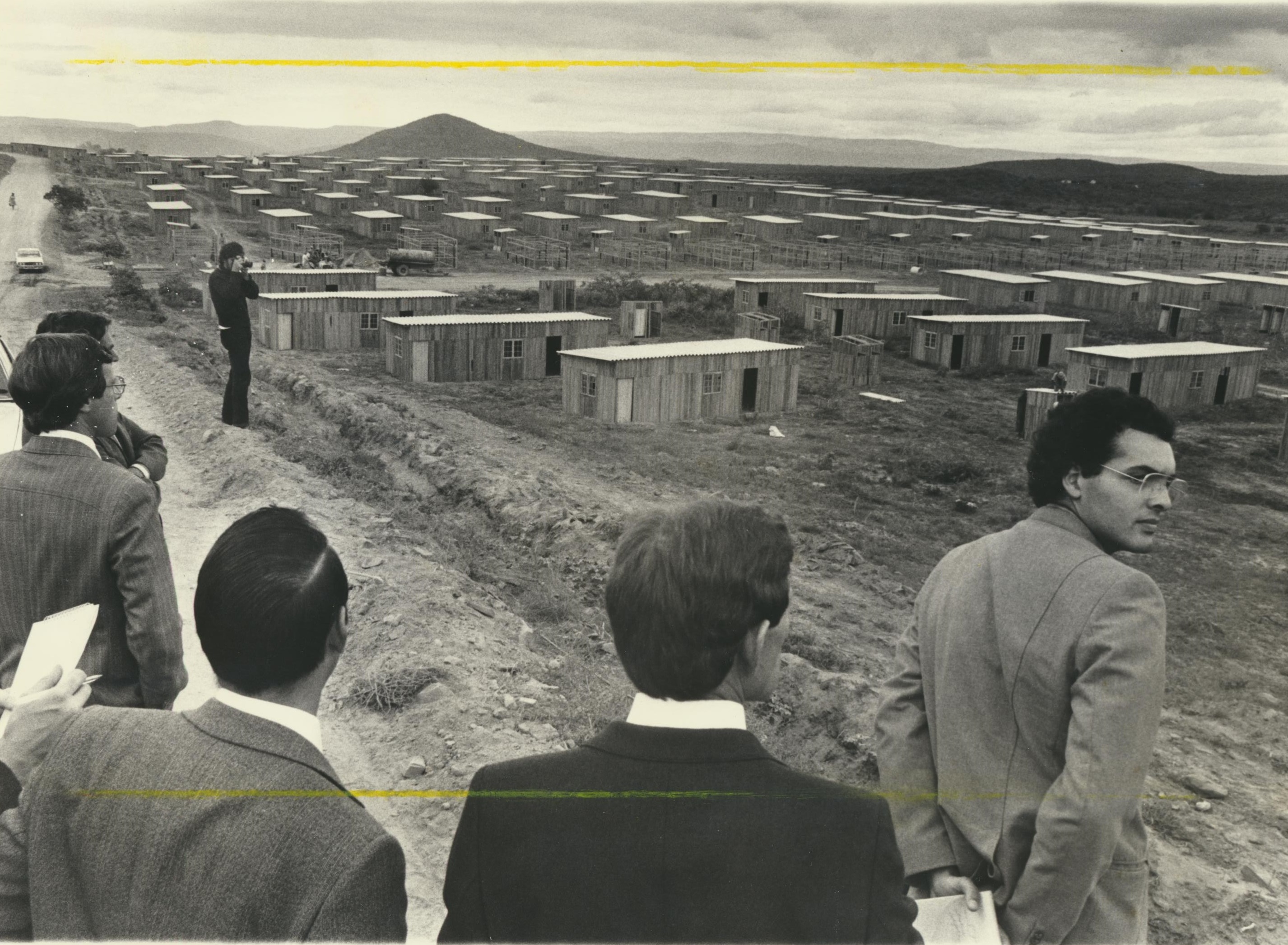 - A series of photographs taken at the time of the Klipfontein evictions, the resultant trial at the Supreme Court Grahamstown, and the eventual settlement of those evicted in the Glenmore resettlement location, showing some of the residents involved, officials, members of the press, as well as aerial and on site views of Glenmore. Photographers: Dave Forbes, Ben Maclennan, Evert Smith, and an unknown photographer. This photograph shows a group of five men, probably members of the East Cape Administration Board who are visiting Glenmore, and a pressman or newspaper reporter taking pictures.