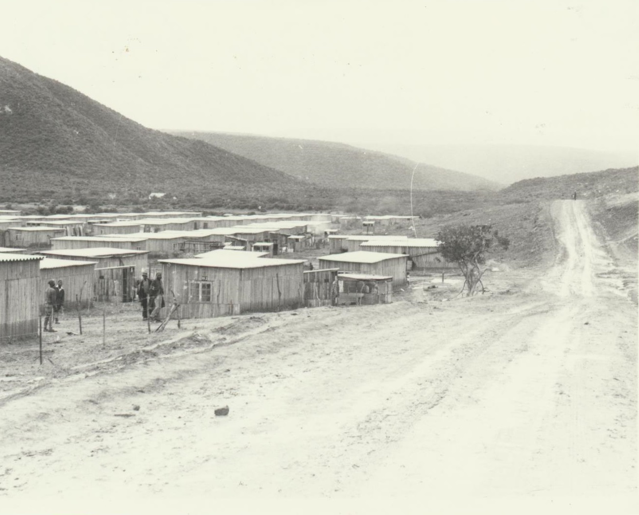 - A series of photographs taken at the time of the Klipfontein evictions, the resultant trial at the Supreme Court Grahamstown, and the eventual settlement of those evicted in the Glenmore resettlement location, showing some of the residents involved, officials, members of the press, as well as aerial and on site views of Glenmore. Photographers: Dave Forbes, Ben Maclennan, Evert Smith, and an unknown photographer. This photograph shows wooden houses or shacks and dirt road that runs behind Glenmore.