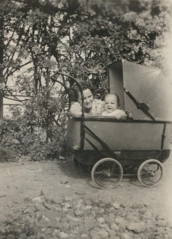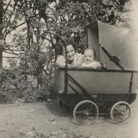 - Photograph of Christopher in a baby carriage, with his mother {presumably a past pupil)