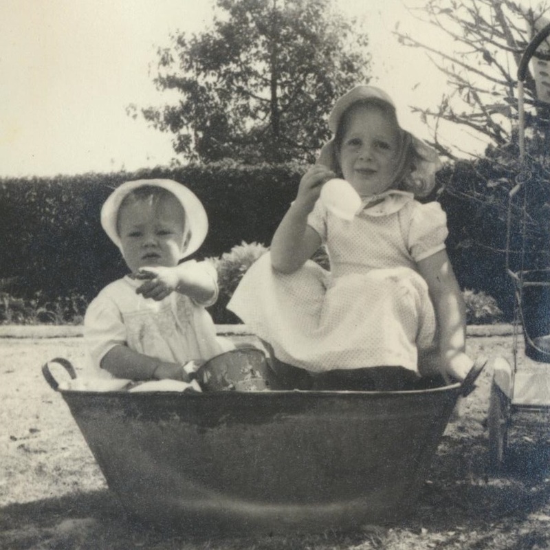 - Photograph of Louise and Melissa Becker sitting in a metal tub