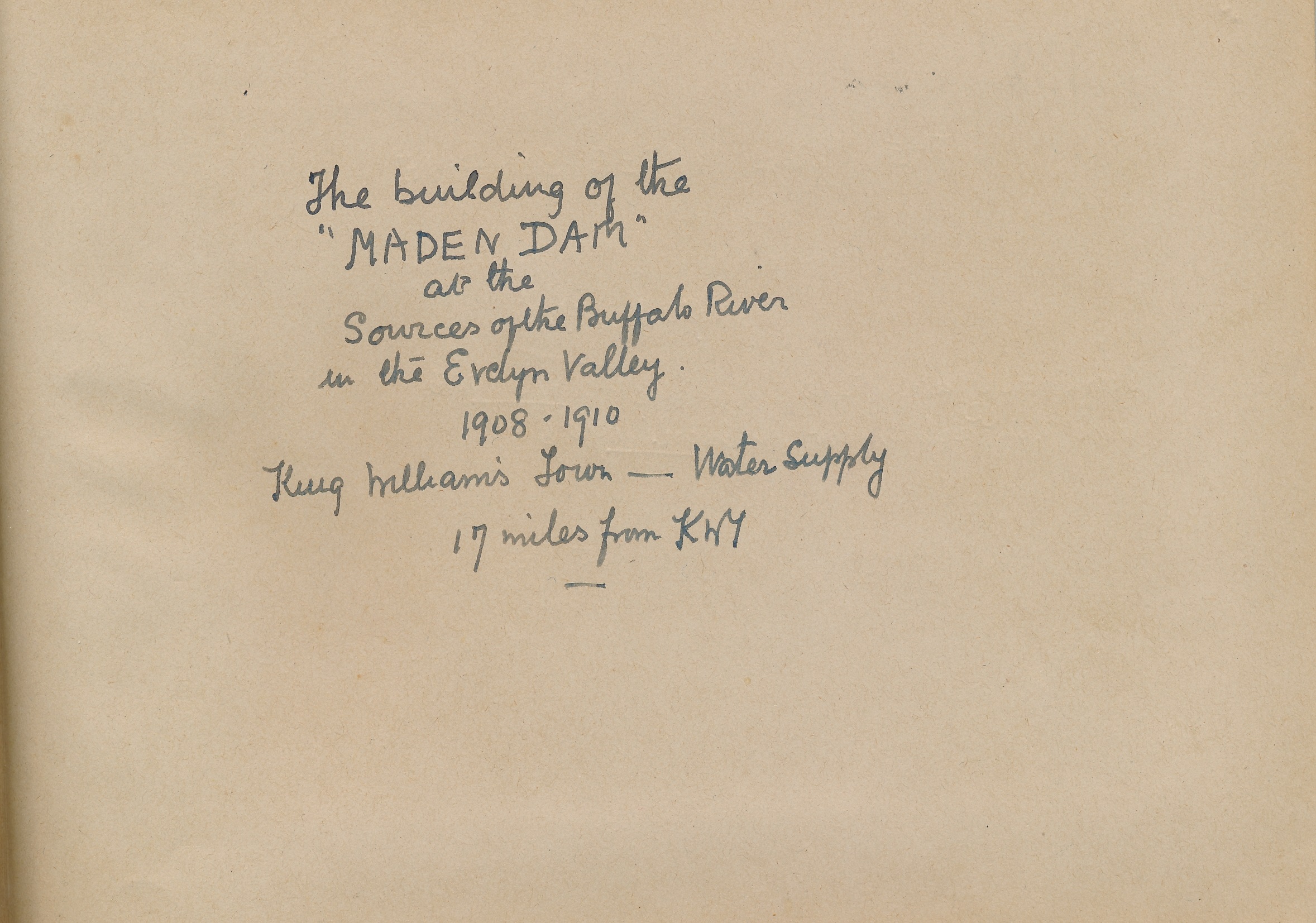 “Front-end paper notes contextualizing the building of the Maden Dam, 1908-1910”, Cory Library and Historical Archives, accessed 28 December 2025, https://digitalarchives.ru.ac.za/s/cory/item/11729