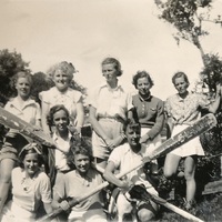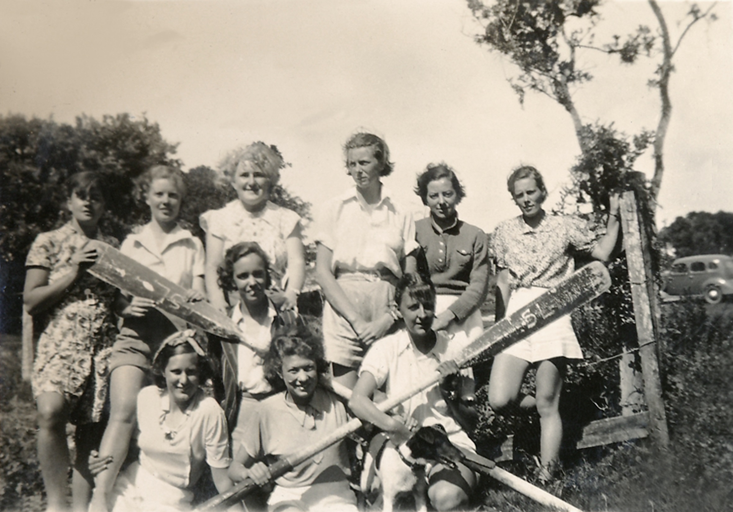 - Photograph titled Ellie, Eileen, Juby, Pearson, Jean, Innocent, Valda, Audrey, Tilda, Fay showing ten women (presumably from a rowing team) holding two oars.