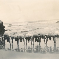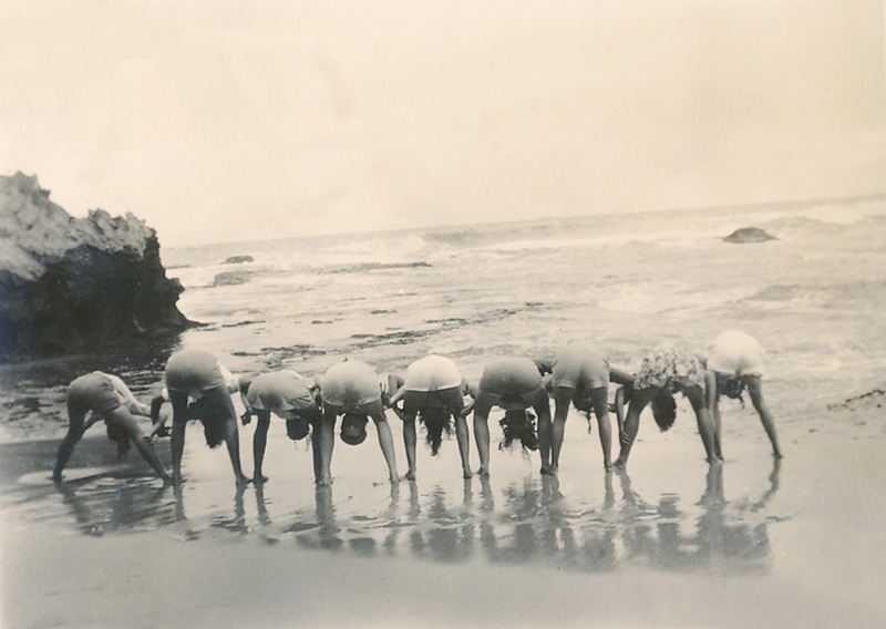 - Photograph titled "Puzzle - Who's who?" showing nine women bent over in a row on the beach
