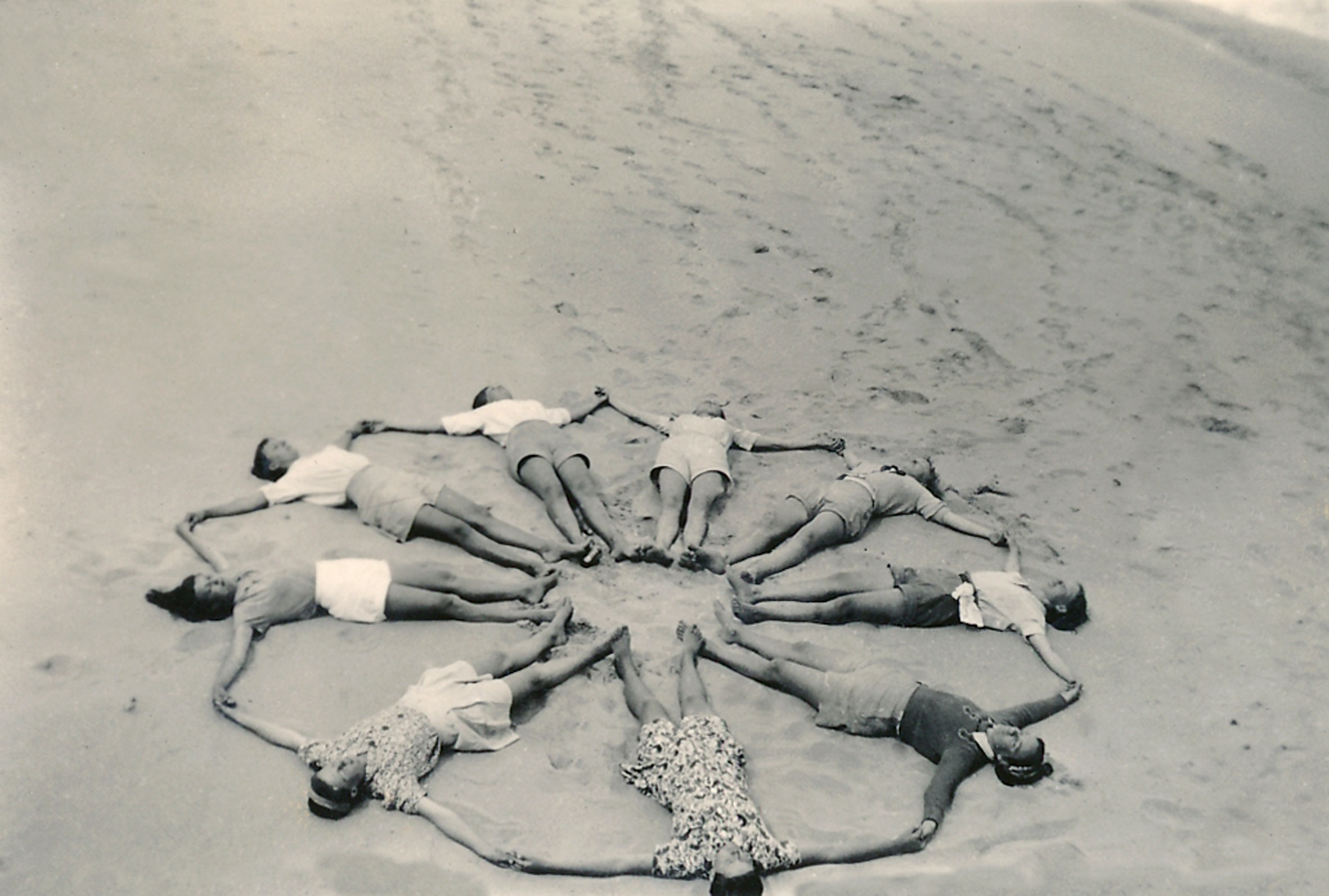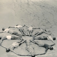 - Photograph titled "The Magic circle" showing nine women lying on the beach in a star formation.