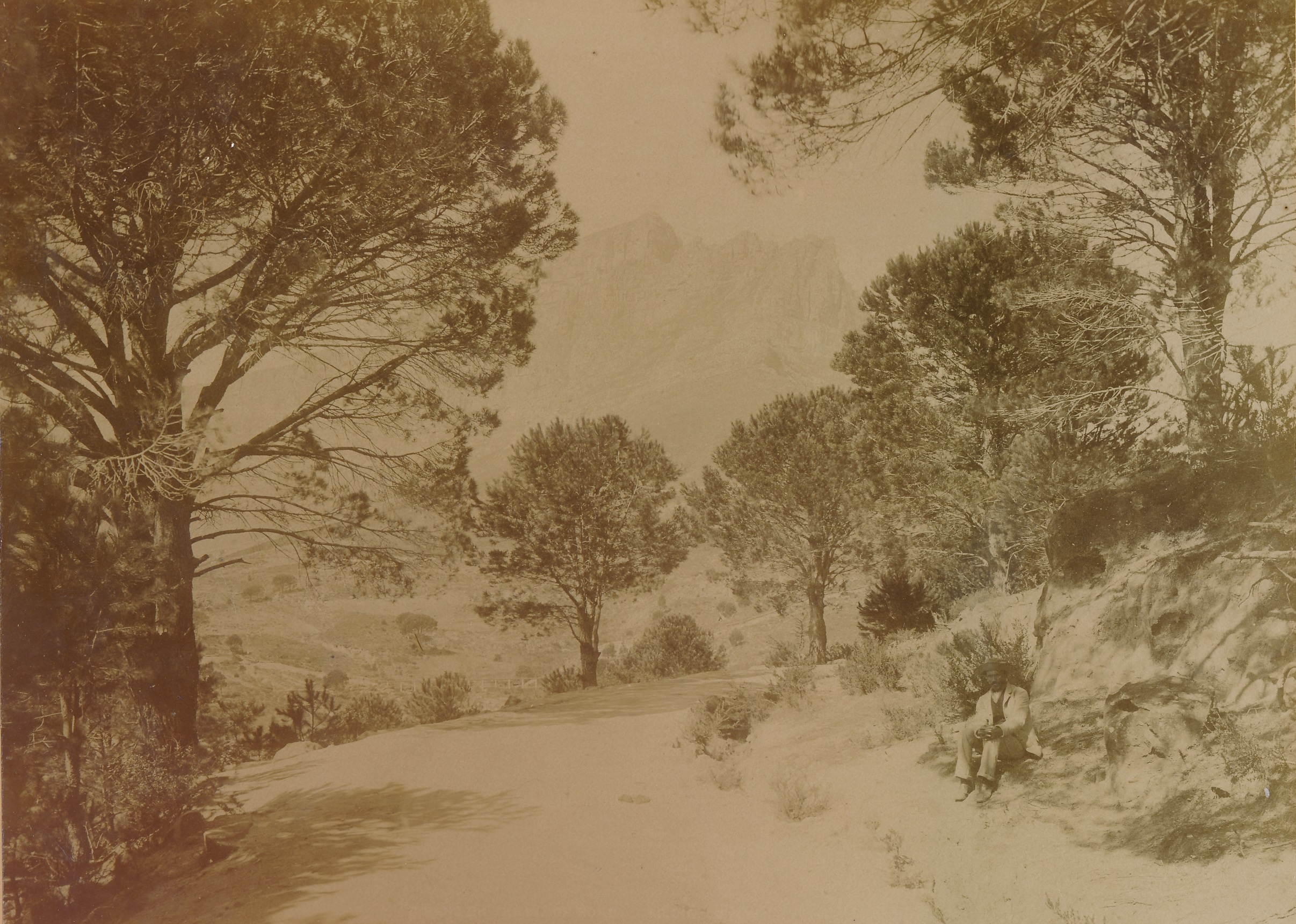 - A photograph showing a man sitting in dry Cape Town landscape, with a slight view of Table Mountain in the background, 1891. The photograph was probably taken by someone who did a tour of Cape Town in 1891. Inscription: "To dear Ethel, from Joe, Xmas 1891"