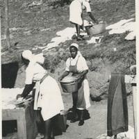 - A photograph album showing views of buildings and people at St Michaels and St Matthews Missions in Keiskammahoek, South Africa.. This photograph is showing three African women, hospital workers doing laundry outside.