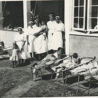 - A photograph album showing views of buildings and people at St Michaels and St. Matthews Missions in Keiskammahoek, South Africa.. This photograph shows nurses and children who suffered from spinal tuberculosis lying on their special orthopedic frames at St Matthews Hospital.