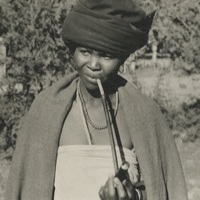 - A photograph album showing views of buildings and people at St Michaels and St. Matthews Missions in Keiskammahoek, South Africa.. This photograph shows a local Xhosa woman smoking a pipe. She is wearing her traditional garb, a doek wrapped around her head show she is married.