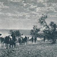 Horse drawn vehicle lead by 3 people