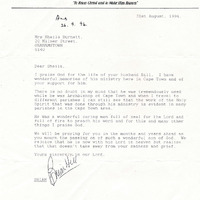 - Letter of condolences, addressed to Sheila Burnett on the death of her husband Bill Bendyshe Burnett, who died on the 23rd of August 1994.