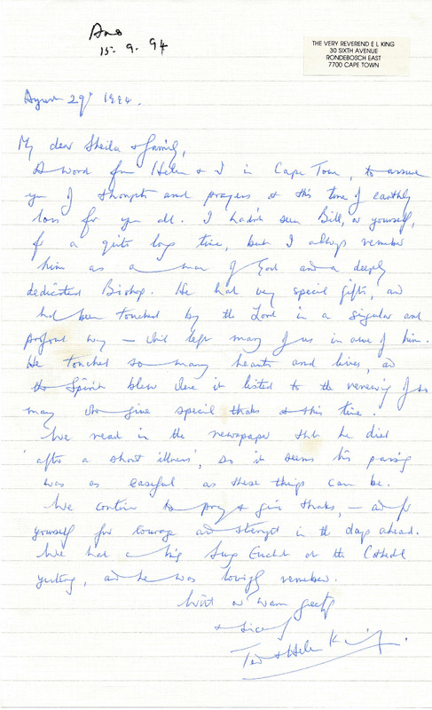 - Letter of condolences, addressed to Sheila Burnett on the death of her husband Bill Bendyshe Burnett, who died on the 23rd of August 1994.